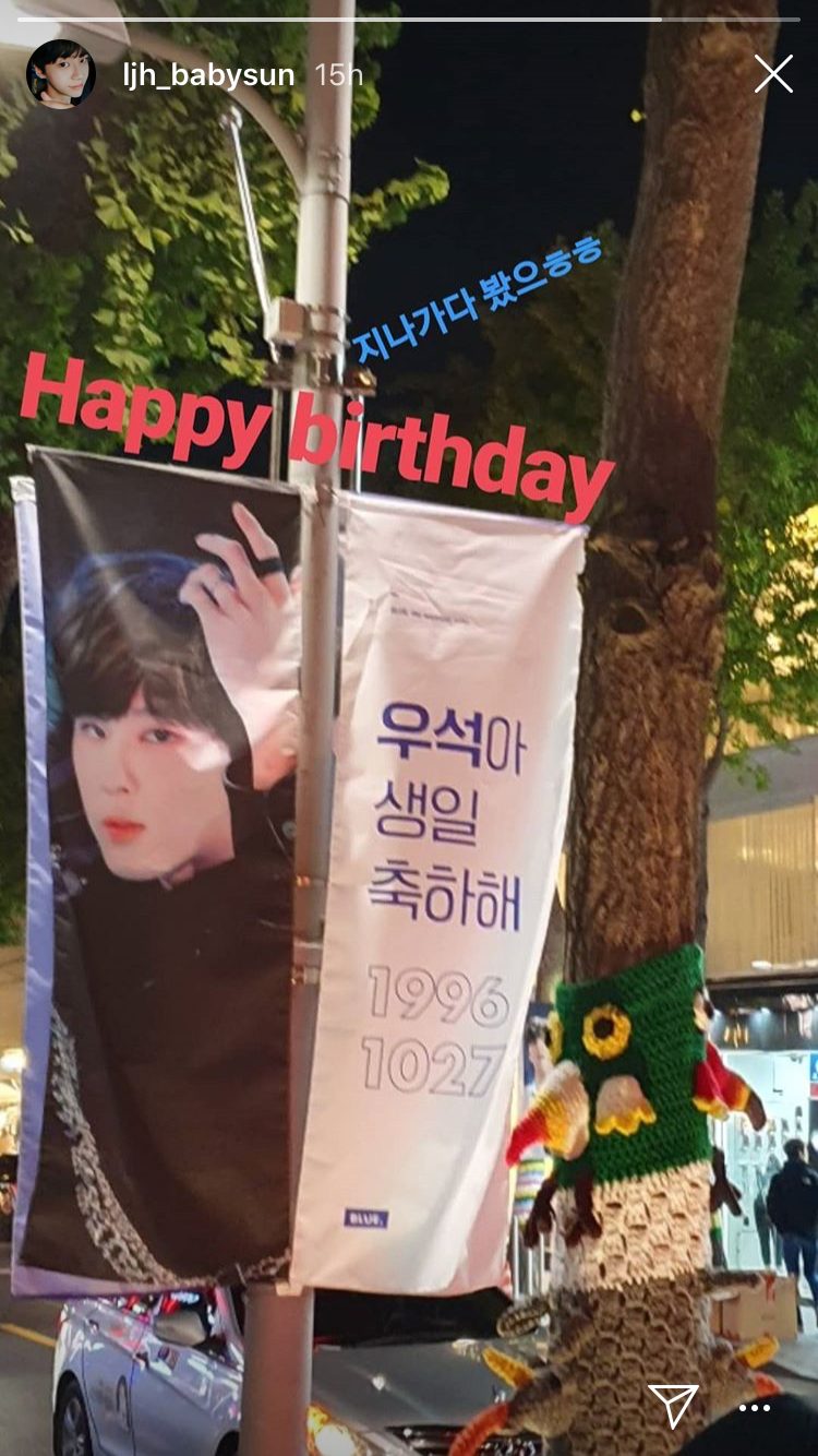 Canh đúng 0h đêm, cực thực tập sinh Produce X 101 - Lee Jin Hyuk (UP10TION), đã chia sẻ bức hình ảnh trên Instagram để chúc mừng sinh nhật người bạn thân. Nam ngôi sao đăng tải bức ảnh quảng cáo trên đường phố mà fan đã dành riêng cho sinh thần của Woo Seok. Lee Jin Hyuk viết: “Mình đã tình cờ thấy khi đi ngang qua, hehe. Chúc mừng sinh nhật cậu”.