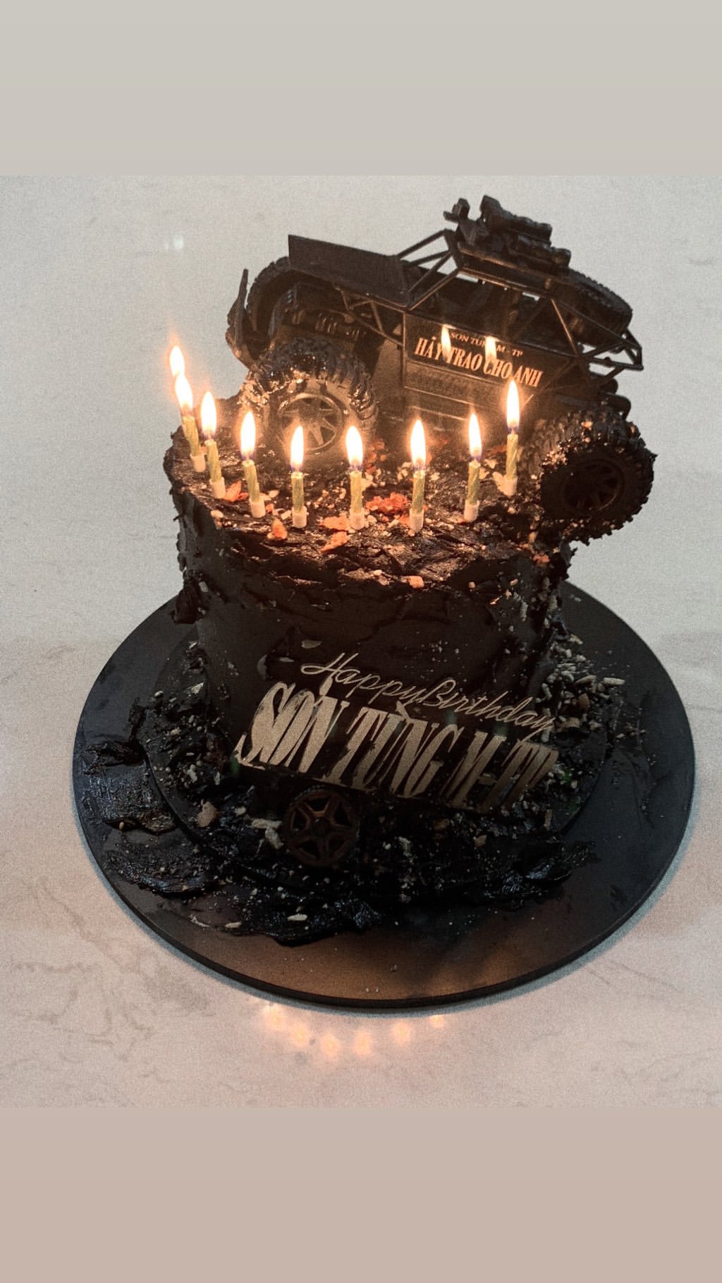 Có thể thấy rằng bữa tiệc diễn ra khá đơn giản. Có vẻ nam ca sĩ lựa chọn tổ chức sinh nhật riêng tư mà không mời nhiều bạn bè đến tham dự. Và chiếc bánh kem được trang trí khá đặc biệt với màu đen làm chủ đạo. Không những thế, trên mô hình chiếc xe ô tô có ghi chữ Hãy trao cho anh.