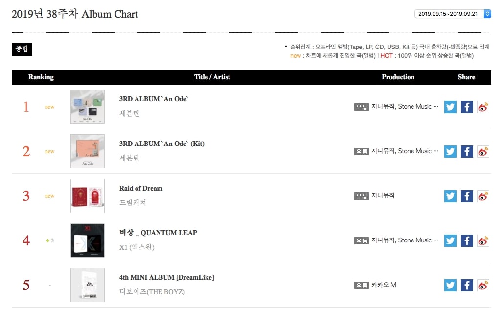 SEVENTEEN thống trị bảng xếp hạng album của tuần này với bản phát hành mới nhất. Album thứ ba của nhóm với tên An Ode không chỉ đứng vị trí số một trên bảng xếp hạng, mà phiên bản Kit cũng đã đứng ở hạng 2. Tiếp đến, album mini mới Raid of Dream của nhóm DreamCatcher đứng hạng 3. Trong khi, Quant Leap của X1 rơi xuống hạng 4 sau ba tuần đứng nhất liên tiếp. DreamLike của The Boyz xếp thứ 5.