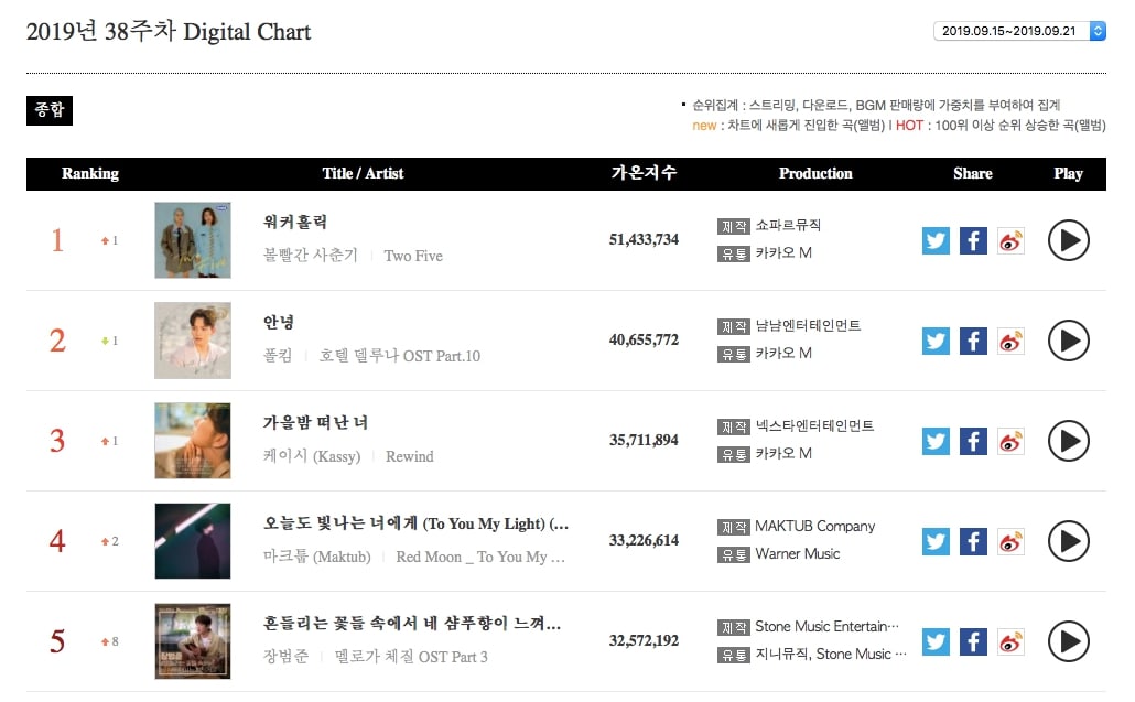 Đến hẹn lại lên, vào ngày 26/09, Gaon đã công bố bảng xếp hạng âm nhạc hàng tháng và hàng tuần mới nhất của mình đến với độc giả từ ngày 15 đến 21/09.