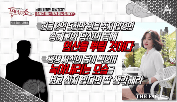 Mới đây, trong chương trình Poongmon của kênh Channel A, người hâm mộ không khỏi hoang mang và lo lắng khi MC bất ngờ tiết lộ Song Hye Kyo từng bị quản lý cũ tống tiền và dọa tạt axit.