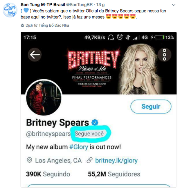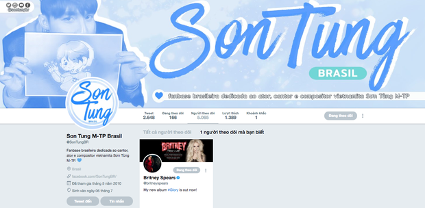 Trang Fanpage do cộng đồng fan Sơn Tùng tại Brazil lập ra được Britney Spears âm thầm ấn theo dõi.
