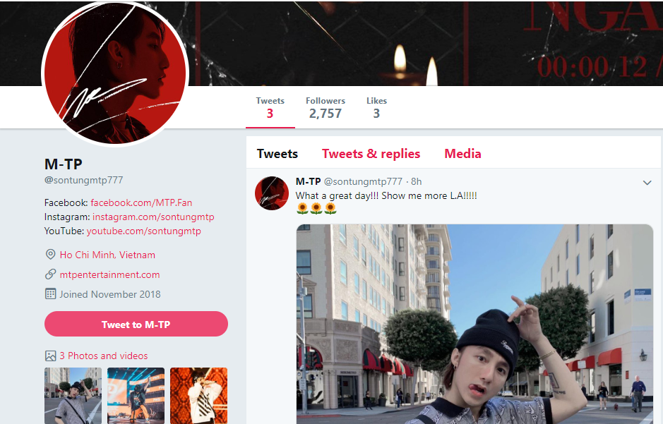 Tuyến đường theo đuổi mục tiêu còn rõ ràng hơn khi Sơn Tùng M-TP chính thức lập thêm tài khoản Twitter. Ở Việt Nam, Twitter không được “chuộng” nhiều bằng Zalo, Facebook. Tuy nhiên, giống như Instagram, Twitter là phương tiện mạng xã hội hữu hiệu giúp liên kết giữa nghệ sĩ và cộng đồng fan quốc tế. Bấy nhiêu đã chứng minh được một phần “tham vọng” vươn ra thế giới của chàng trai trẻ.