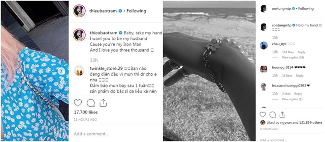 Mới đây, trên trang cá nhân, cặp đôi Sơn Tùng - Thiều Bảo Trâm bất ngờ chủ động công khai hình ảnh với chế độ chụp giống nhau. Với động thái mới nhất này, nhiều người cho rằng đây chính là dấu hiệu ngầm thừa nhận tình cảm của cả hai đang vô cùng thắm thiết và hạnh phúc.