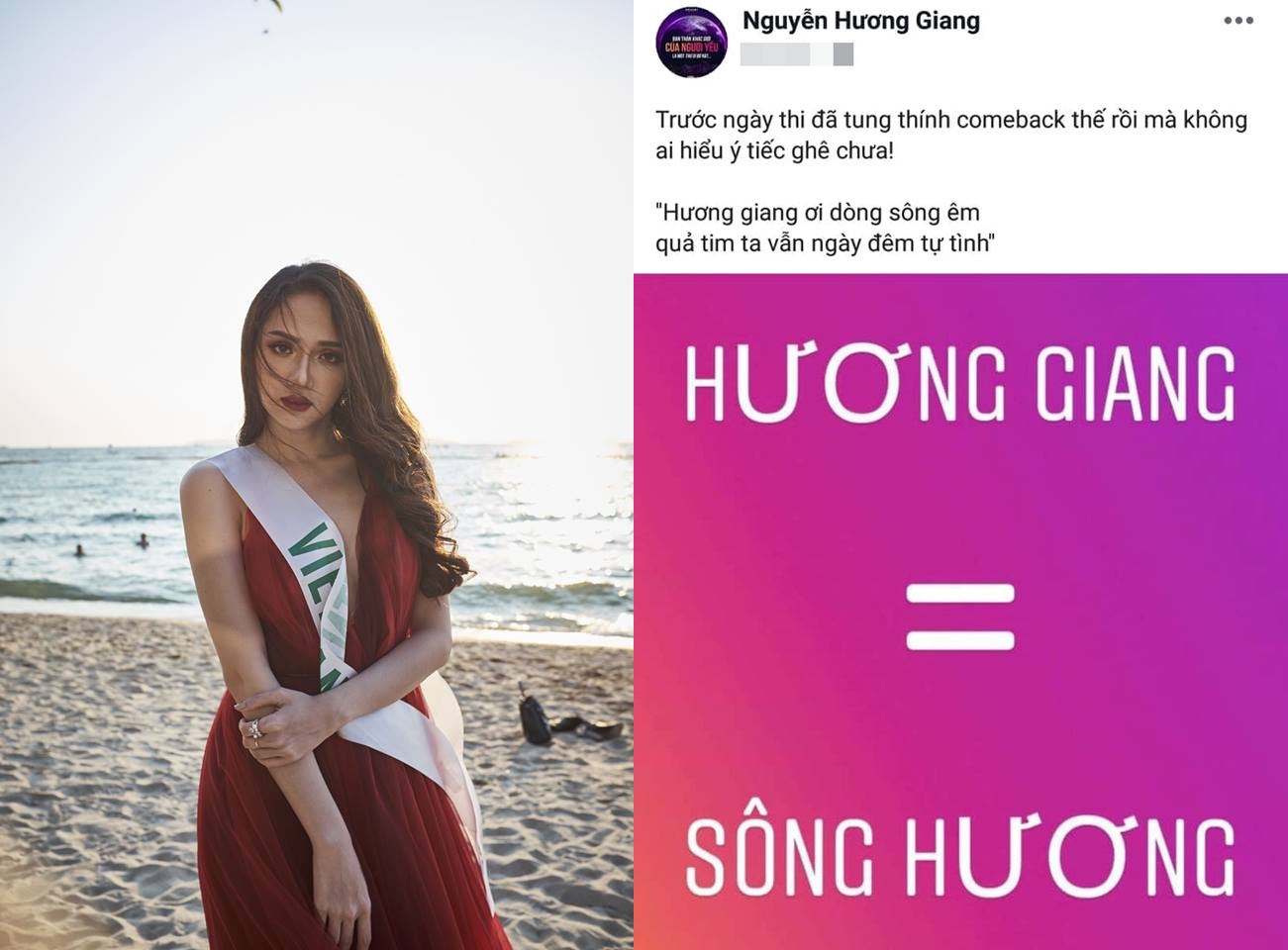 Cái tên Hương Giang của Hoa hậu Chuyển giới Quốc tế 2018 có ý nghĩa là dòng sông Hương. Ngay sau khi biết được đề thi Ngữ văn của các sĩ tử 2k1, huấn luyện viên Giọng hát Việt nhí 2019 đã hóm hỉnh chia sẻ trên trang cá nhân rằng cô nàng đã “thả thính” dự đoán chuẩn xác trước ngày thi: “Trước ngày thi đã tung thính 'comeback' thế rồi mà không ai hiểu ý tiếc ghê chưa. Hương giang ơi dòng sông êm / Quả tim ta vẫn ngày đêm tự tình”.