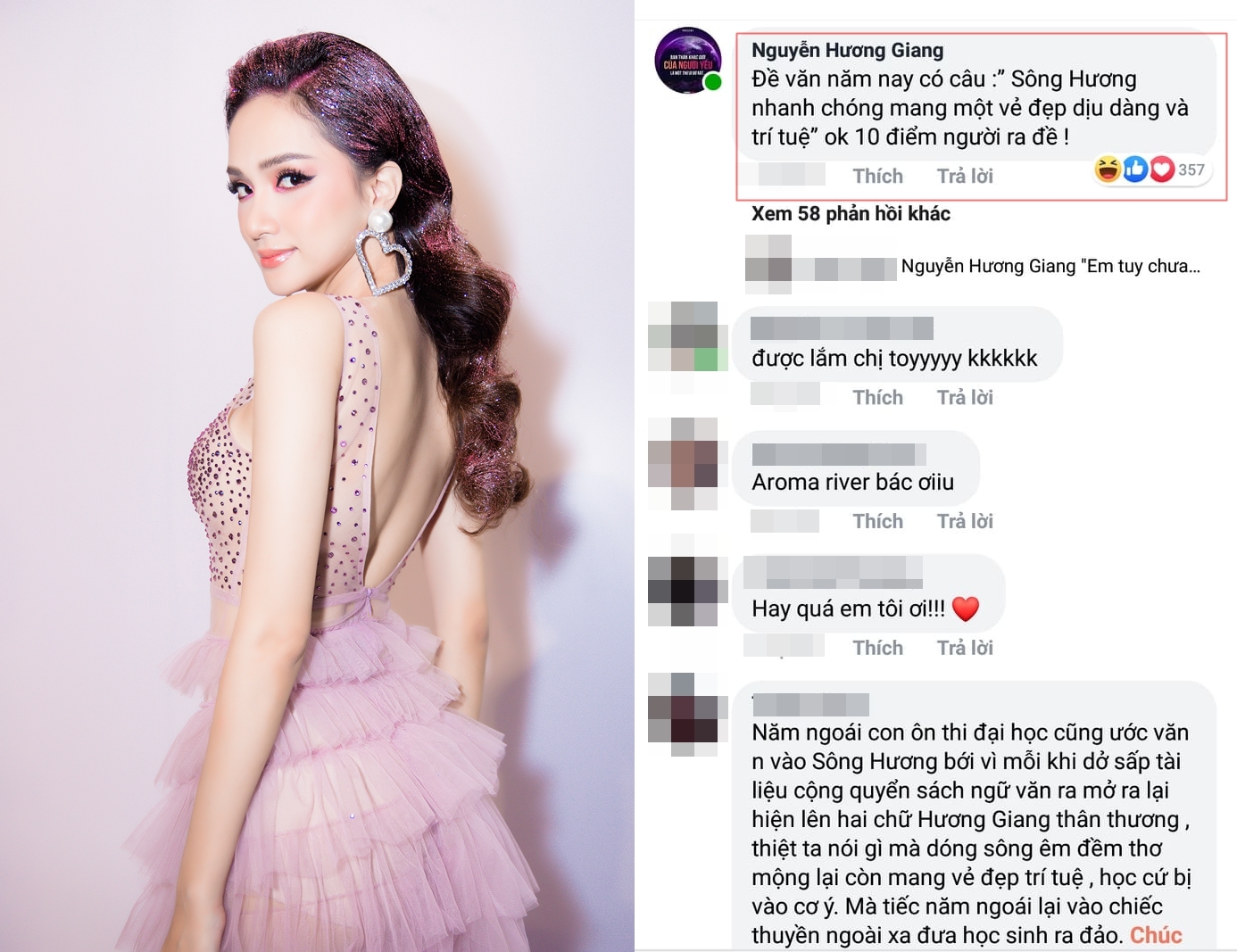 Bên dưới phần bình luận, Hương Giang còn tự hào vì ý nghĩa tên mình - sông Hương được đưa vào đề thi với những câu từ đầy trân trọng của tác giả Hoàng Phủ Ngọc Tường: “Đề văn năm nay có câu: 'Sông Hương nhanh chóng mang một vẻ đẹp dịu dàng và trí tuệ', 10 điểm người ra đề“.