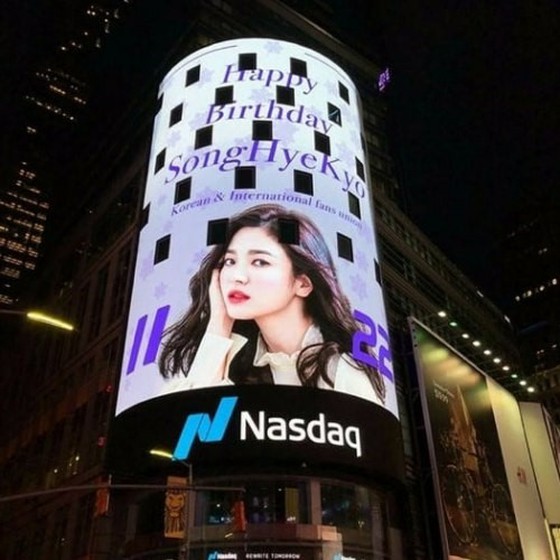 Một quảng cáo kỷ niệm ngày sinh nhật của Song Hye Kyo đã xuất hiện ở quảng trường Thời Đại. Quảng cáo sẽ chạy từ ngày 17/11 đến ngày 22/11 này là do các fan Hàn và fan quốc tế sắp xếp cho thần tượng.