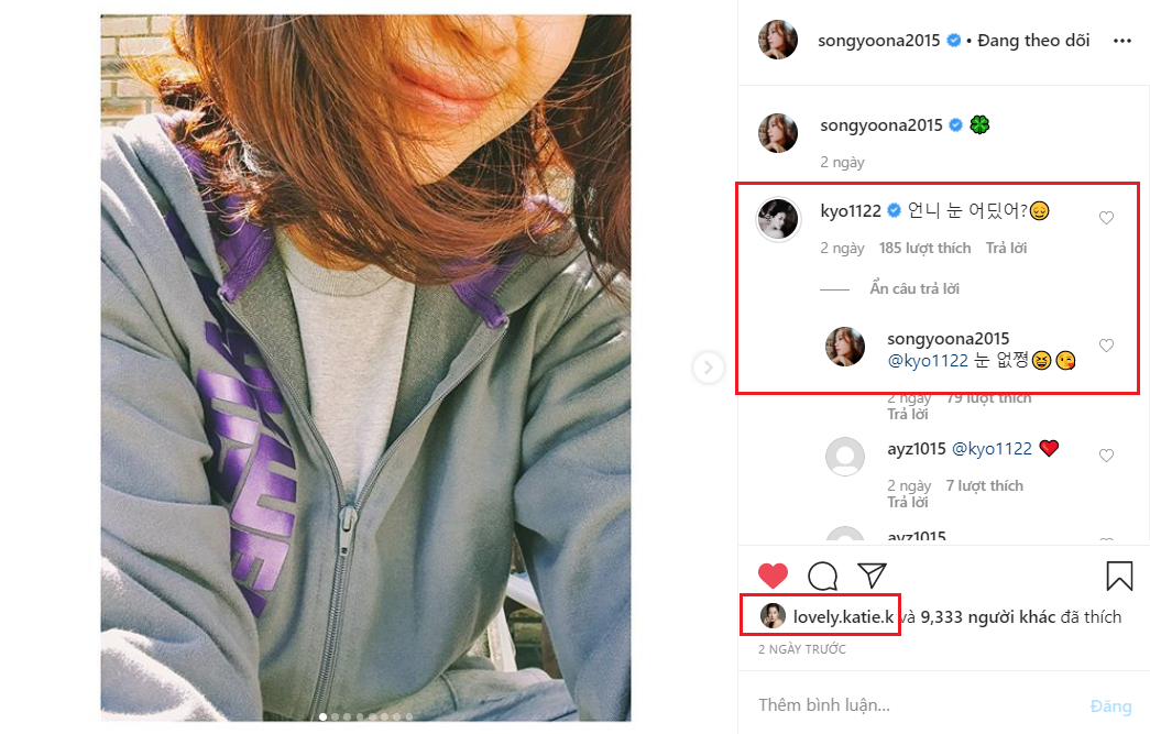Nhận thấy được bức ảnh của người chị thân thiết, nữ diễn viên Song Hye Kyo đã bình luận: “Chị ơi, mắt đâu rồi?”. Ngay sau đó, Song Yoon Ah thể hiện tình bạn gần gũi và đã phản hồi: “Không có mắt nè”. Ngoài ra, Lee Tae Ran – chị hai trong drama ăn khách Những nàng công chúa nổi tiếng, đã để lại bình luận: “Chị ơi, em nhớ chị quá à”. Nữ diễn viên trả lời: “Chị cũng vậy, chị cũng vậy”. Bên cạnh đó, Kim Hee Sun cũng thả like cho bài đăng này.