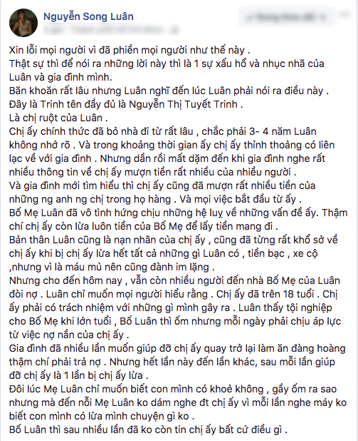 Song Luân đăng tải dòng trạng thái này vì anh không muốn bất kỳ ai bị chị gái anh lừa nữa. Anh nhắn gửi: “Cũng mong mọi người vì Luân chia sẻ tin này để cho những ai không biết hoặc sắp biết thì nên cảnh giác với người chị của Luân, đừng nhẹ dạ. Đừng để chị ấy lừa tiền! Vì Luân từng ở hoàn cảnh giống những nạn nhân khác, là em ruột và bố mẹ mà chị ấy còn nhẫn tâm đưa Luân, bố mẹ vào rất nhiều lần khốn khổ thì người ngoài chắc chắn chị ấy không hề có tình đâu”.