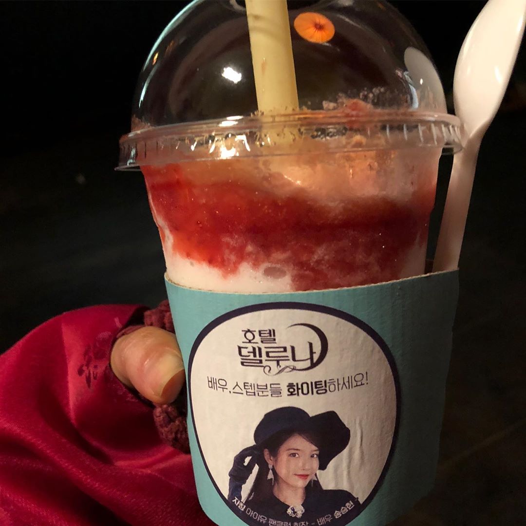 Cô nàng cũng chia sẻ ảnh chụp món đồ uống mà mình đang dùng với phần băng giấy tạo hình nhân vật Jang Man Wol kèm lời nhắn “Cố lên cả đoàn!”