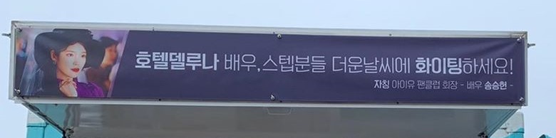 Trong khi đó Song Seung Hun cũng cho mọi người biết anh rất hâm mộ IU và tự nhận là trưởng FC IU. Trên tấm băng rôn xe tải, Song Seung Hun còn nhắn nhủ “Trong thời tiết nắng nóng này, cố lên các diễn viên và nhân viên Hotel del Luna! Trưởng FC IU tự phong - Diễn viên Song Seung Hun - “