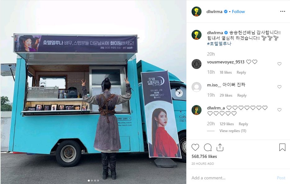 Trong phần caption, IU đã viết tin nhắn cám ơn Song Seung Hun: “Cám ơn Song Seung Hun sunbaenim!! Em sẽ lấy lại sức và cố gắng hết mình!!”