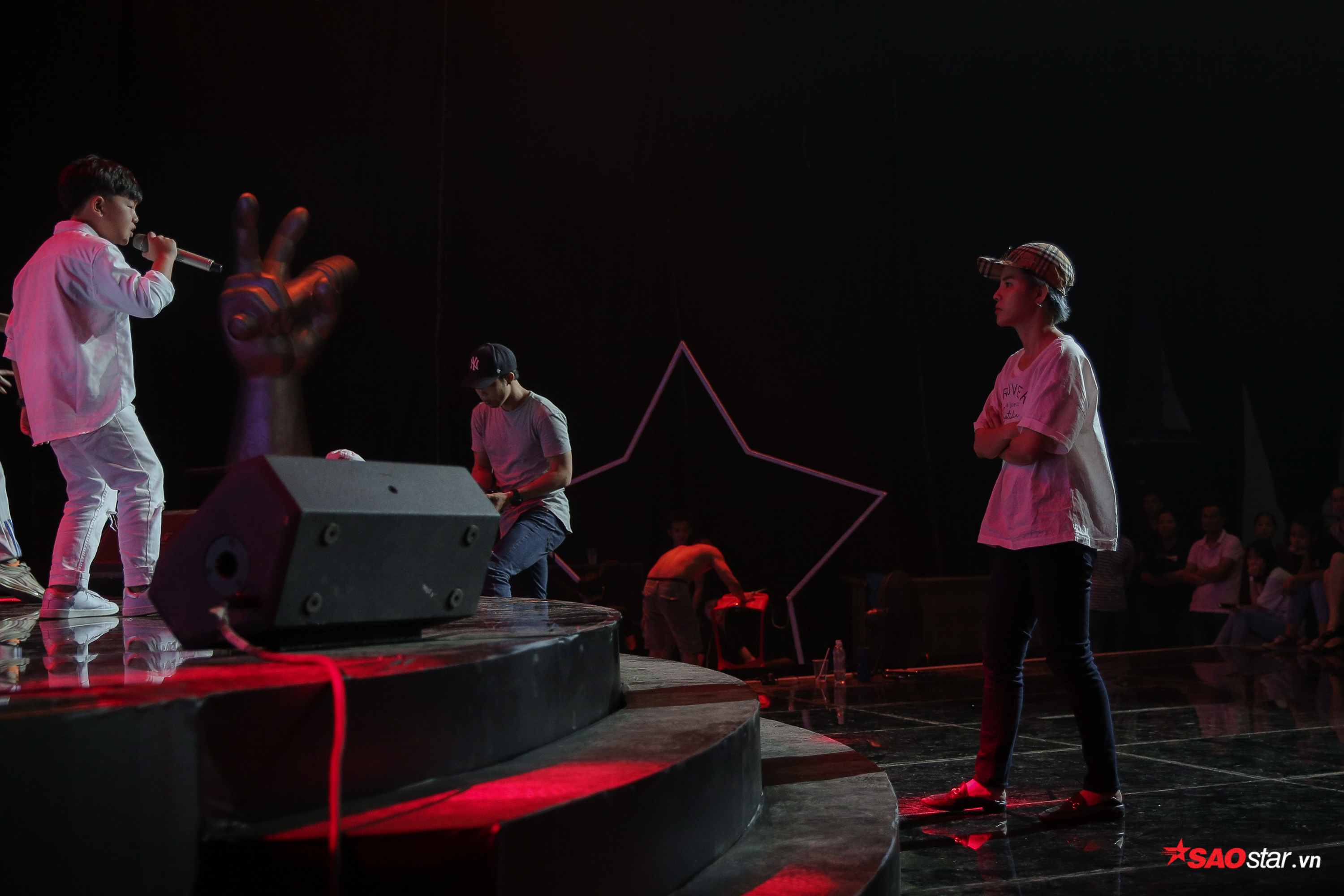 Dù luôn có cách chia sẻ hóm hỉnh và gần gũi trên sân khấu nhưng cũng chẳng khó hiểu khi cả Vũ Cát Tường lẫn Soobin Hoàng Sơn đều khá căng thẳng trong ngày tổng duyệt minishow của team. Nếu không đến ngay sát học trò để thị phạm từng câu hát, cô Mèo và ba Bin cũng chẳng rời sân khấu nửa bước và dõi theo từng bước nhảy, từng nốt phiêu của thí sinh đội nhà.