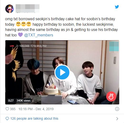 Sau khi lễ trao giải MAMA kết thúc, cũng là sinh nhật của Soobin (TXT). Giống như đàn anh của mình, Soobin cũng mừng sinh nhật bằng livestream cùng các fan hâm mộ. Điều thú vị xảy ra khi các fan hâm mộ nhận ra rằng anh chàng cũng đội một chiếc bánh sinh nhật trên đầu. Hóa ra đây chính là chiếc mũ mà trước đó không lâu anh cả của BTS mới đội trên thảm đỏ. Phát hiện thú vị này khiến cả ARMY và MOA( fanclub của TXT) không khỏi thích thú.