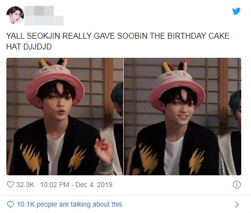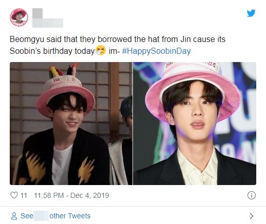 Trước sự tinh ý và nhanh mắt của các fan hâm mộ, Beomgyu chia sẻ rằng mình đã mượn tiền bối chiếc mũ đặc biệt này để tổ chức sinh nhật cho Soobin. Trước đây, Soobin cũng từng chia sẻ rằng mình rất hâm mộ tiền bối Jin, điều này càng khiến các fan thích thú trước tương tác của 2 anh chàng cũng như chúc mừng Soobin trở thành fan boy thành công.