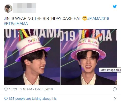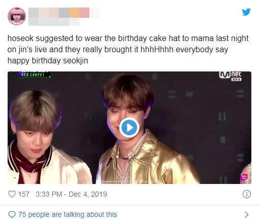 Trước hình ảnh đáng yêu của Jin với chiếc bánh sinh nhật đội trên đầu, J-Hope đã nảy ra ý tưởng đầy hài hước khi “rủ rê” anh cả đội chiếc mũ này lên thảm đỏ của MAMA. Trước sự hào hứng của J-Hope, Jin chỉ có thể trả lời rằng sẽ cân nhắc thêm về việc này. Nhưng nào ngờ, anh chàng chẳng có sự lựa chọn nào khác, bởi ngay tại thảm đỏ MAMA, cậu em J-Hope đã chuẩn bị sẵn chiếc mũ bánh sinh nhật và đội nó lên đầu anh.