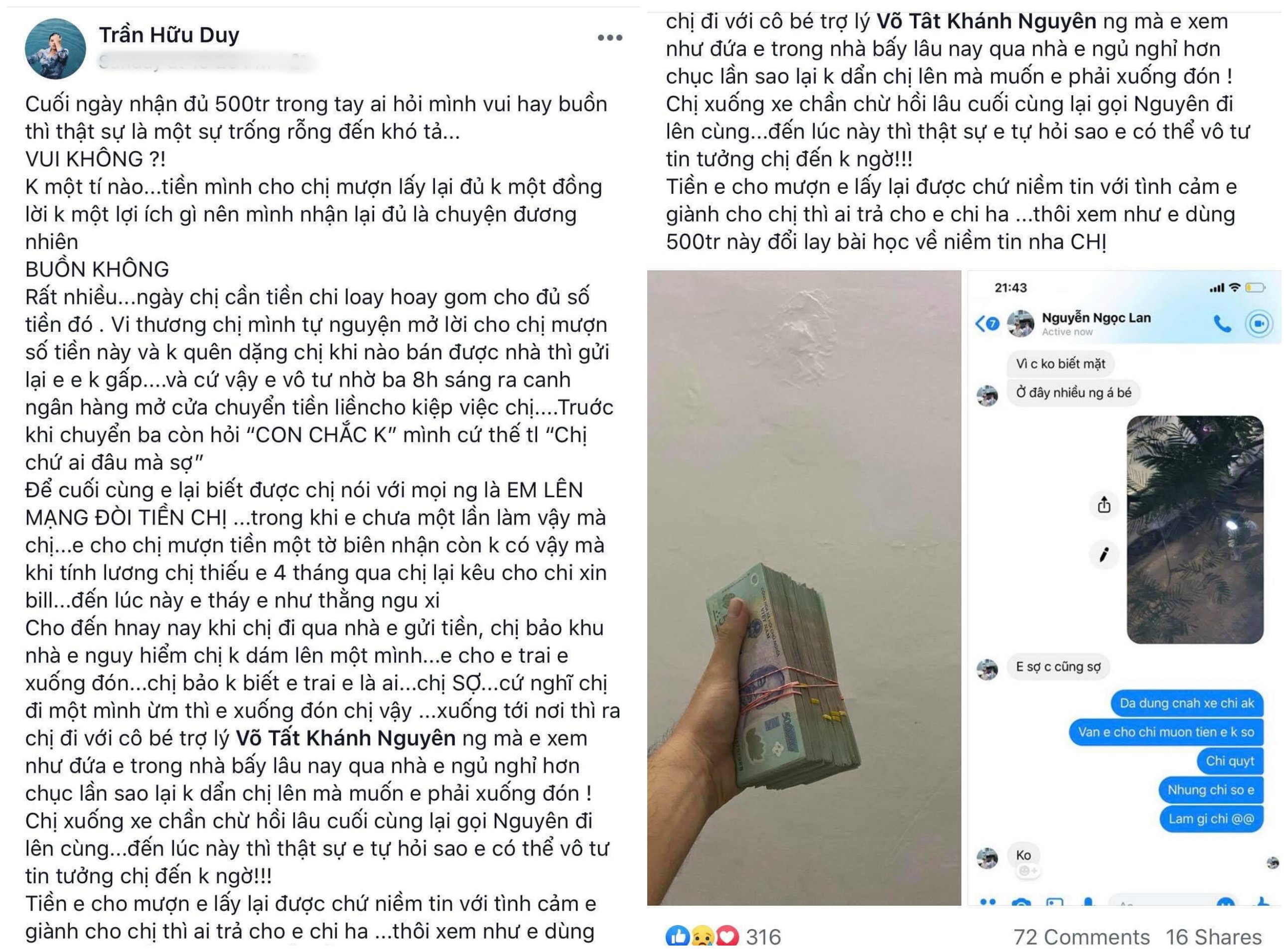Stylist cũ của Ngọc Lan nói thêm khi rút 500 triệu cho chị mượn để giải quyết chuyện li dị không hề tính toán hay đòi hỏi một sự bảo đảm nào nhưng sau đó thái độ của nữ diễn viên với anh hoàn toàn trái ngược. Cuối cùng dù nhận lại được đủ tiền nhưng anh cảm thấy vô cùng thất vọng về người chị mình tin tưởng.