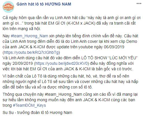 Ngay sau khi nhận được tin nhắn cáo trạng trên fanpage về hành vi đạo nhái của Jack và K-ICM, đại diện đoàn lô tô đã đăng bài công khai để đính chính sự việc. Cụ thể, họ đã sử dụng lại đoạn điệp khúc trong Em gì ơi để đưa vào bài hát gọi lô tô của mình sau khi nhìn thấy bản demo trên Youtube. Điều này đồng nghĩa với việc Jack và K-ICM không hề đạo nhạc với ca khúc Em gì ơi.