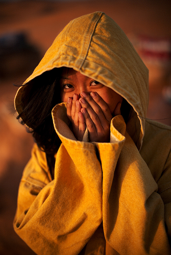 Suboi được một người bạn hỗ trợ quàng khăn để tránh cái nắng và cát bay vào mặt.
