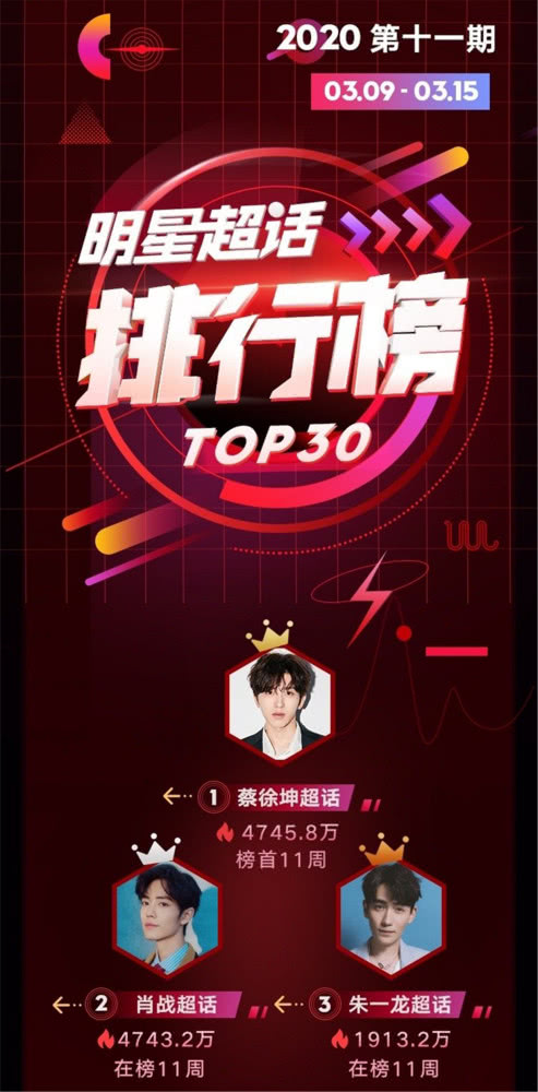 Kỳ thứ 9 năm 2020 (24/2 - 01/3), sức ảnh hưởng của Thái Từ Khôn là 47,792 triệu, của Tiêu Chiến là 47,738 triệu (khoảng cách của hai người là 54 ngàn). Kỳ 10 năm 2020 (2/3 - 8/3) thì khoảng cách hai người đã rút ngắn xuống còn 32 ngàn. Kỳ 11 năm 2020 (9/3 - 15/3) khoảng cách hai người chỉ còn có 260 ngàn và đến kỳ 12 năm 2020 (16/3 - 22/3 - tính đến tối 11h ngày 20/3) thì khoảng cách hai người chưa đến 10 ngàn. Rất có khả năng Tiêu Chiến sẽ vượt qua được cả Thái Từ Khôn, dẫn đầu trong bảng xếp hạng nhóm siêu chủ đề minh tinh sắp tới đây.