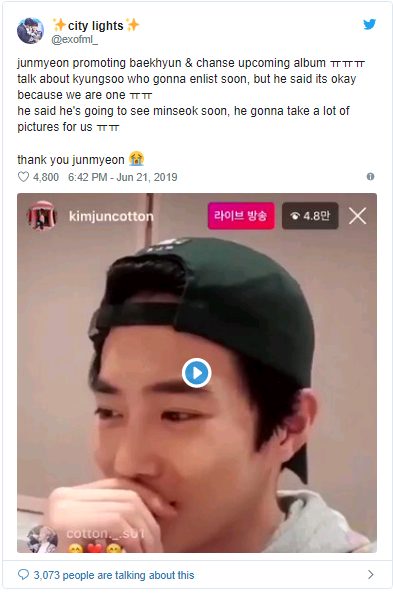 Suho đã có buổi livestream trò chuyện vui vẻ và tương tác với fan trên Instagram. Tuy nhiên, anh cũng khiến các fan bất ngờ vì những lời khen dành cho các thành viên còn lại trong nhóm. Trong khi EXO đang chuẩn bị cho các kế hoạch bận rộn sắp tới, Suho bắt đầu bằng cách quảng cáo cho màn solo của Baekhyun cũng như nhóm nhỏ của Chanyeol Sehun sắp tới.
