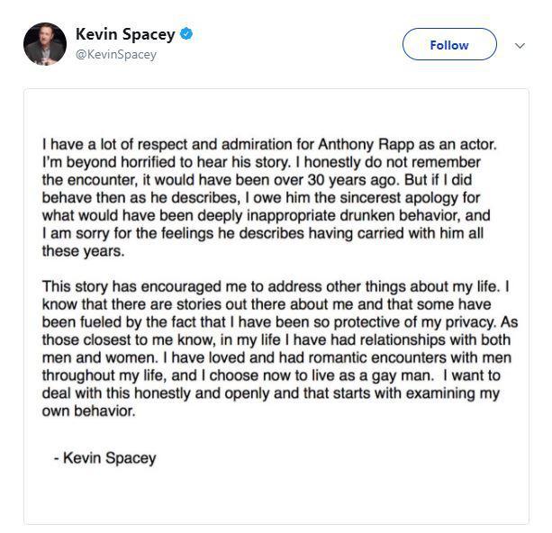 Spacey, hiện tại đã 58 tuổi, ông chia sẻ trên mạng xã hội rằng mình thành thật xin lỗi và “những gì tôi đã làm đều xuất phát từ hành vi không đúng mực khi say của mình”. Ông chia sẻ bản thân từng trải qua những mối quan hệ tình cảm nghiêm túc giữa một người đàn ông và một người phụ nữ. Nhưng có lẽ, từ giờ ông sẽ chọn cách sống như một người đồng tính.