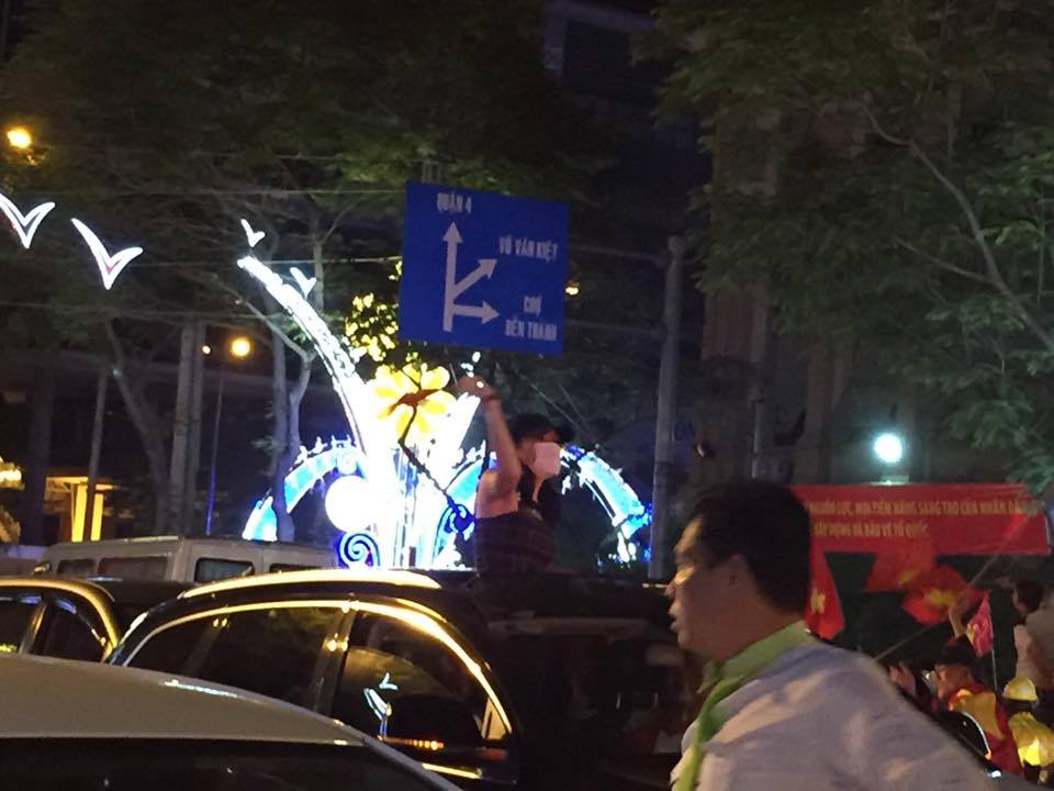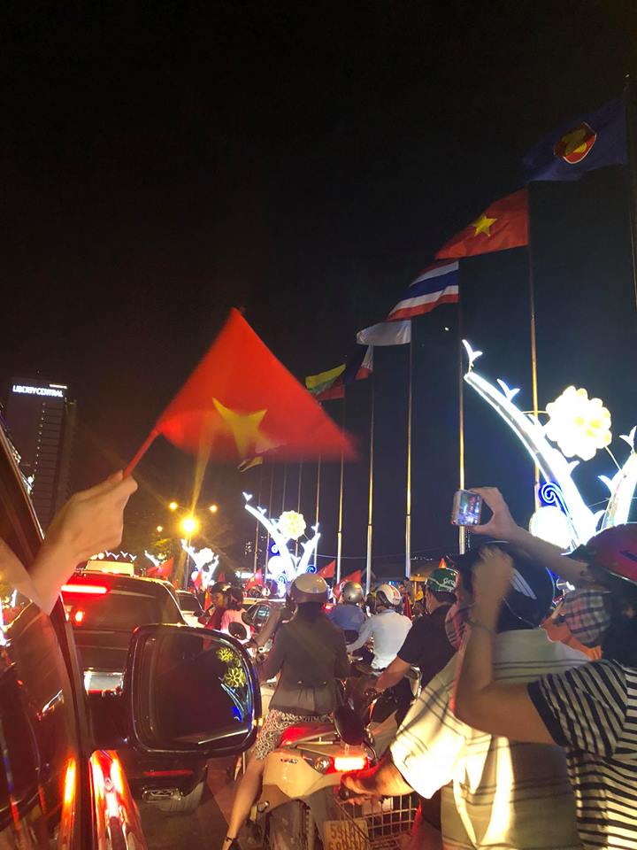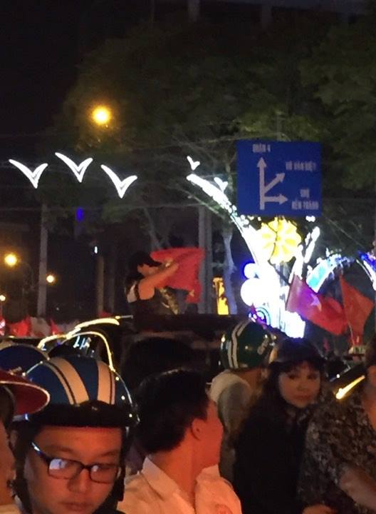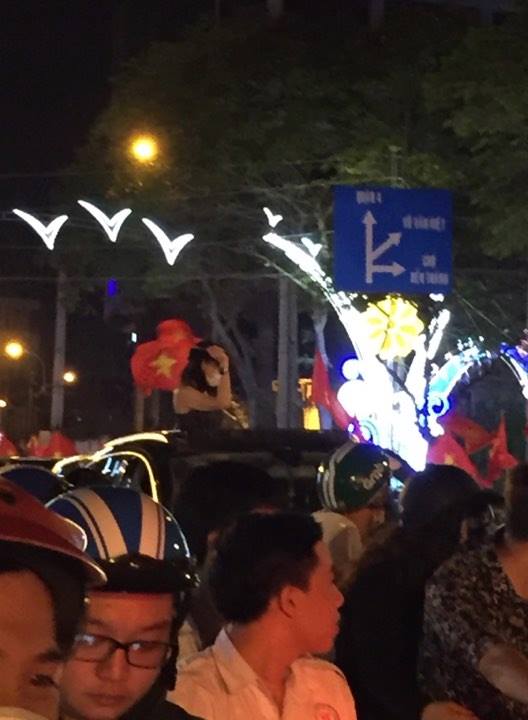 Họa mi tóc nâu xuống phố hòa vào dòng người để chung vui cùng các cổ động viên Việt Nam.