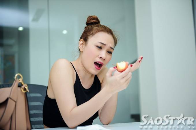 Cuối đoạn clip, Mỹ Tâm bất ngờ đứng lên và di chuyển về phía khác, tuy nhiên, trên tay cô vẫn cầm quả táo và vừa đi cô vẫn không ngừng hát khiến người xem không nhịn được cười.