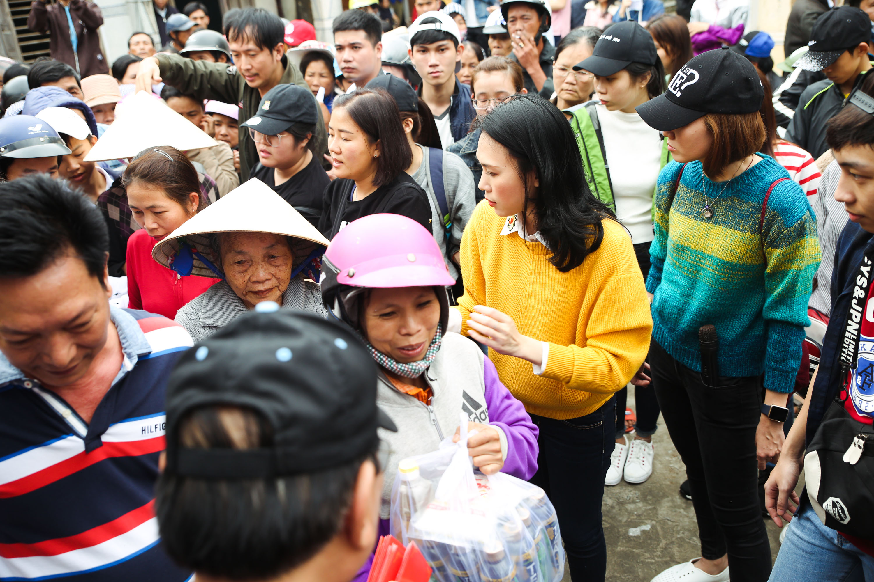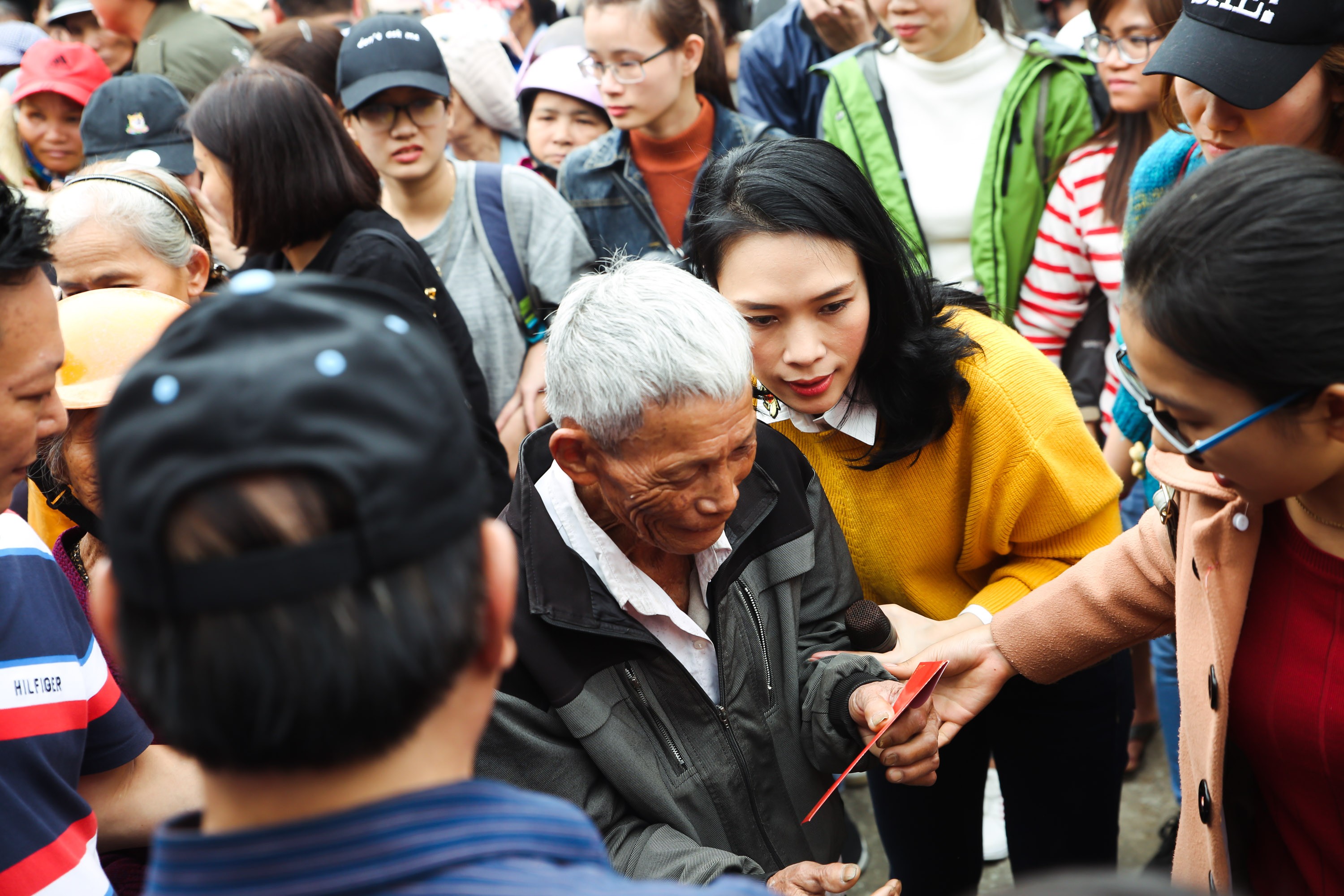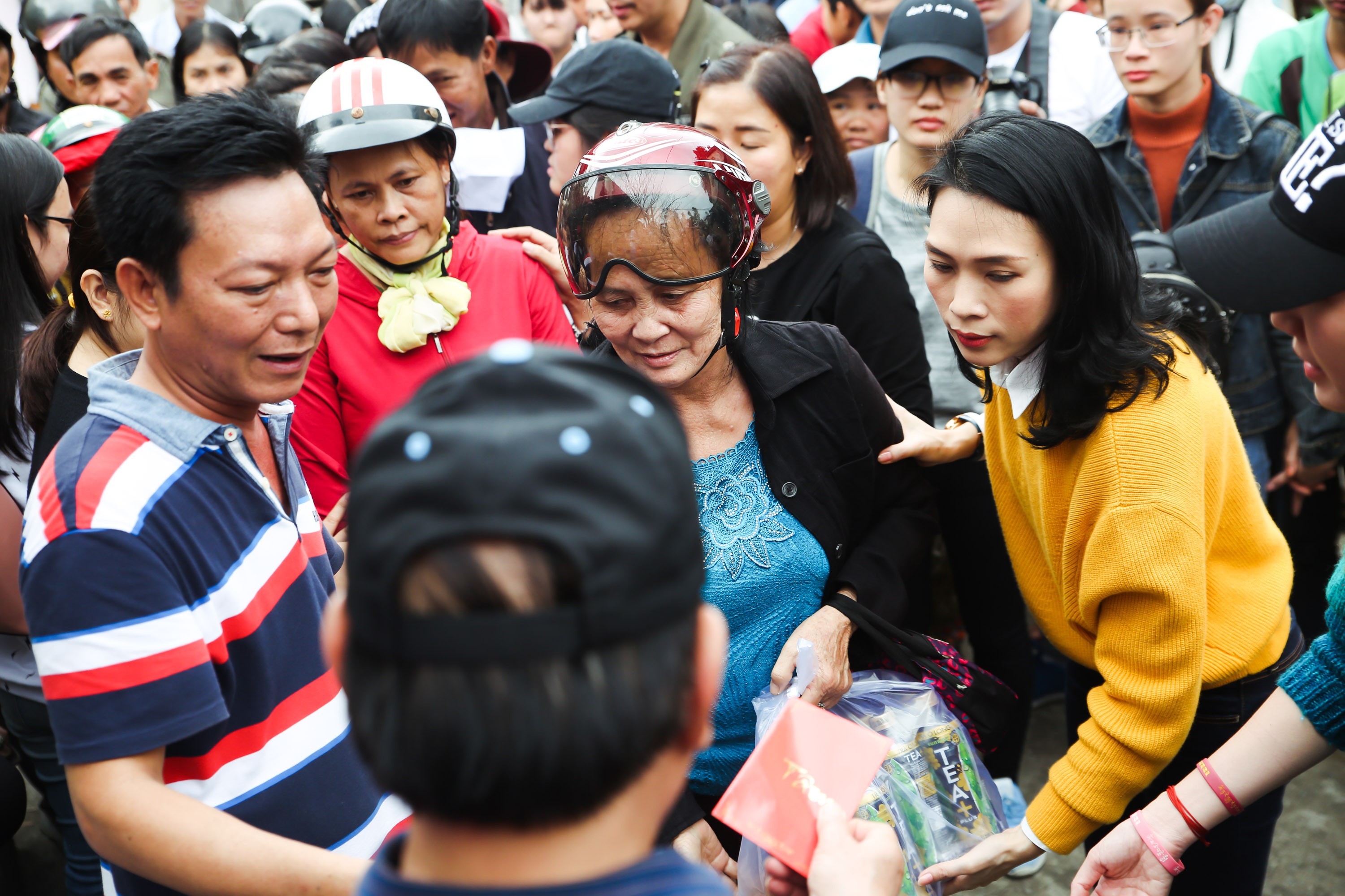 Mỹ Tâm ân cần trao quà cho từng bà con.
