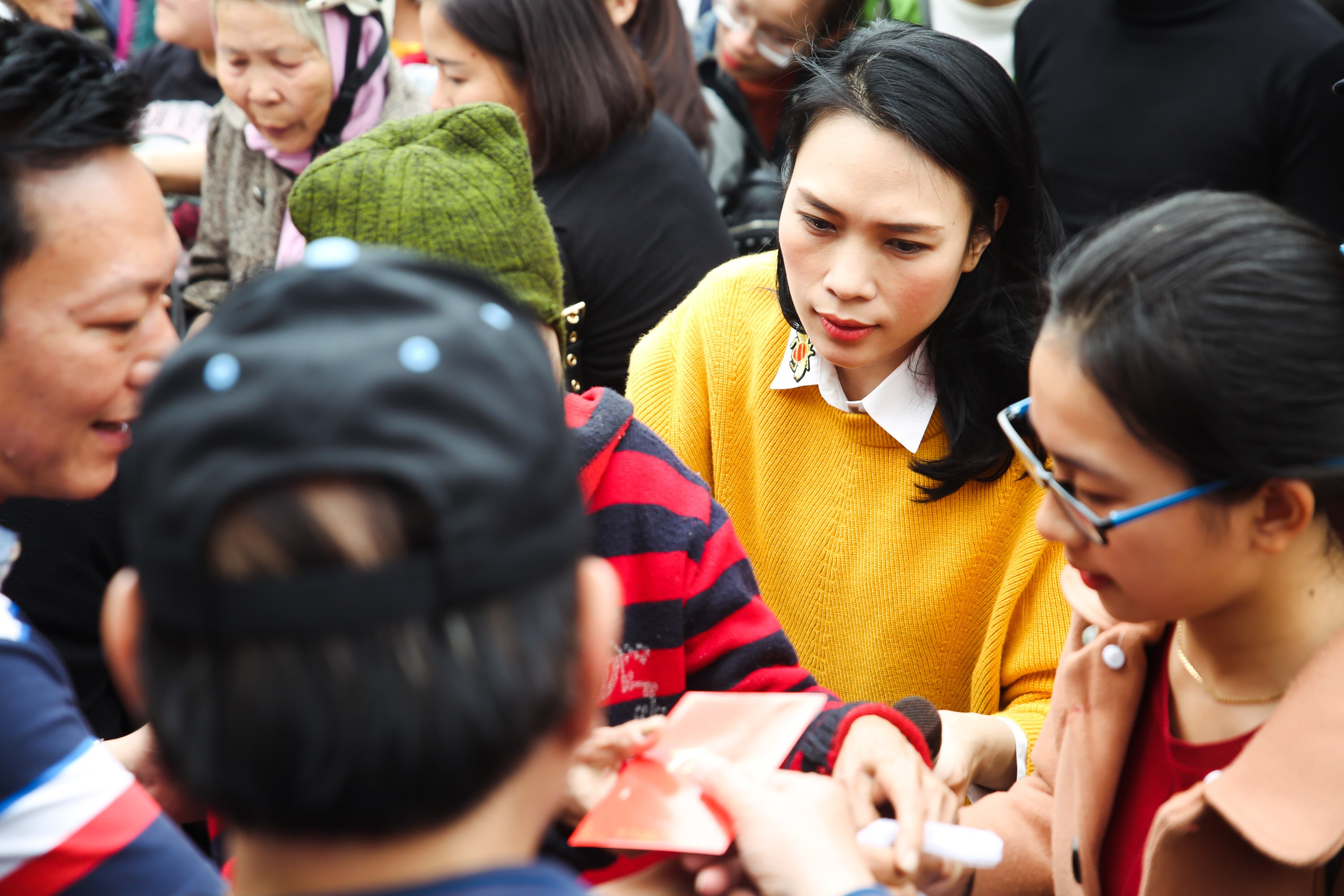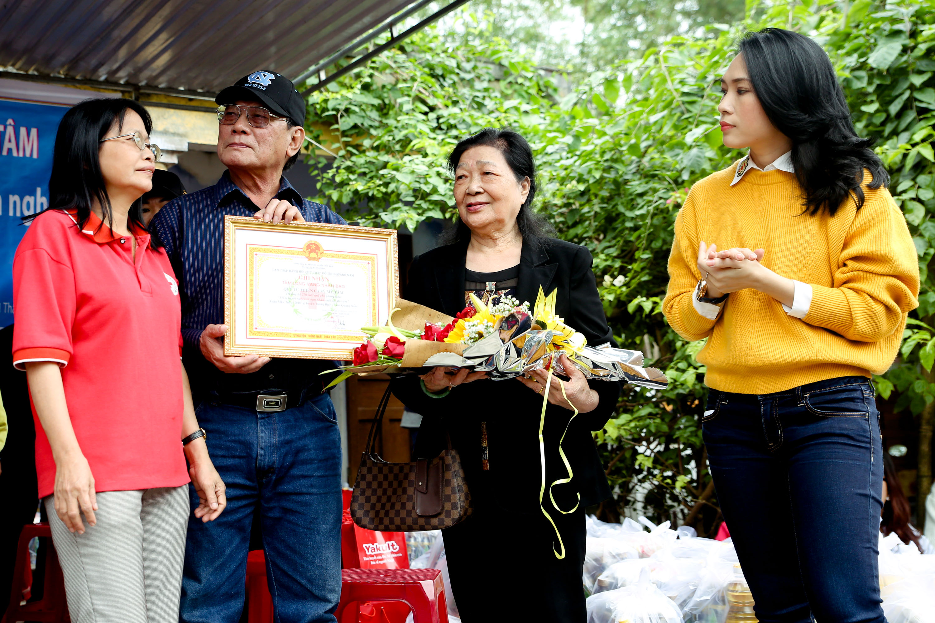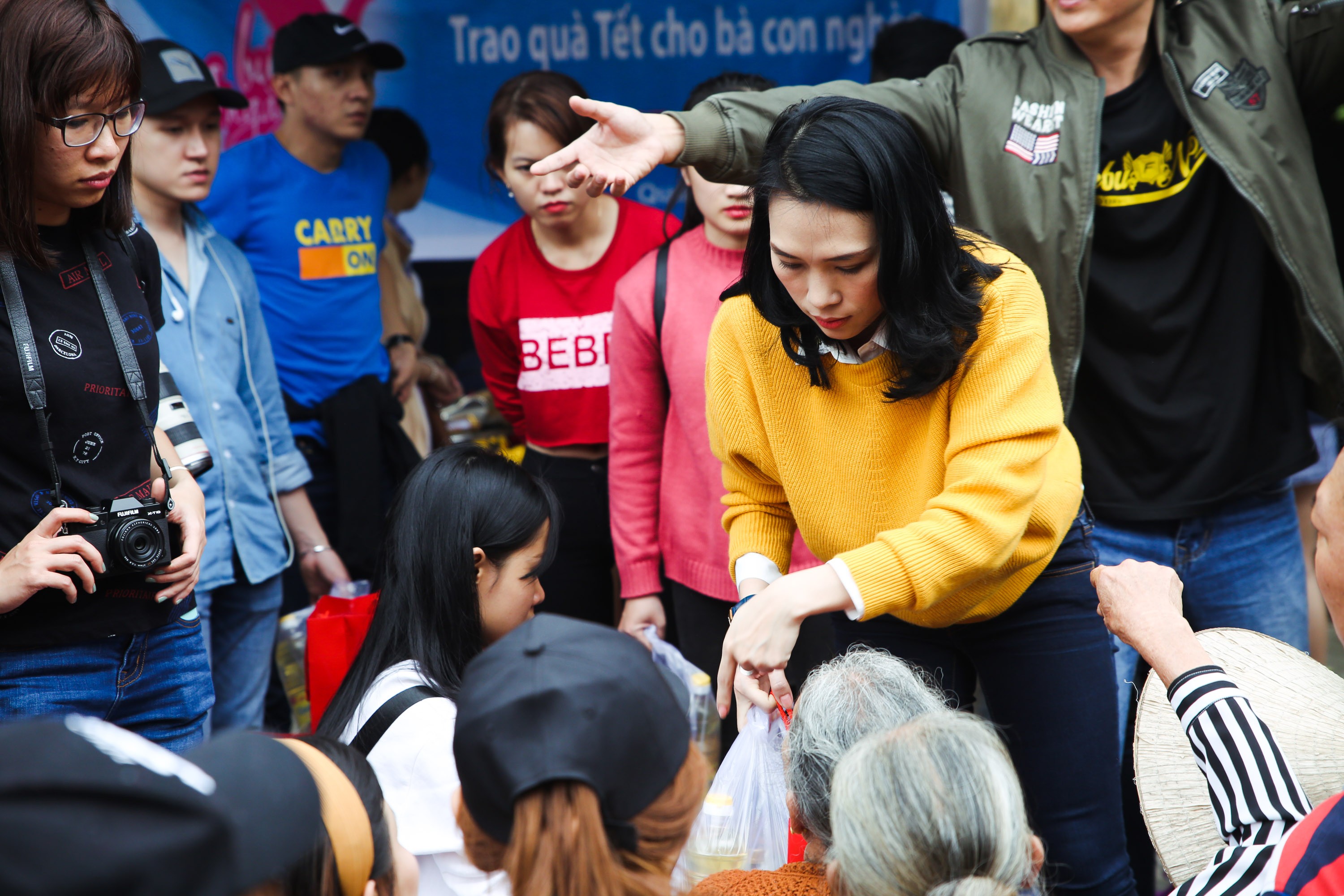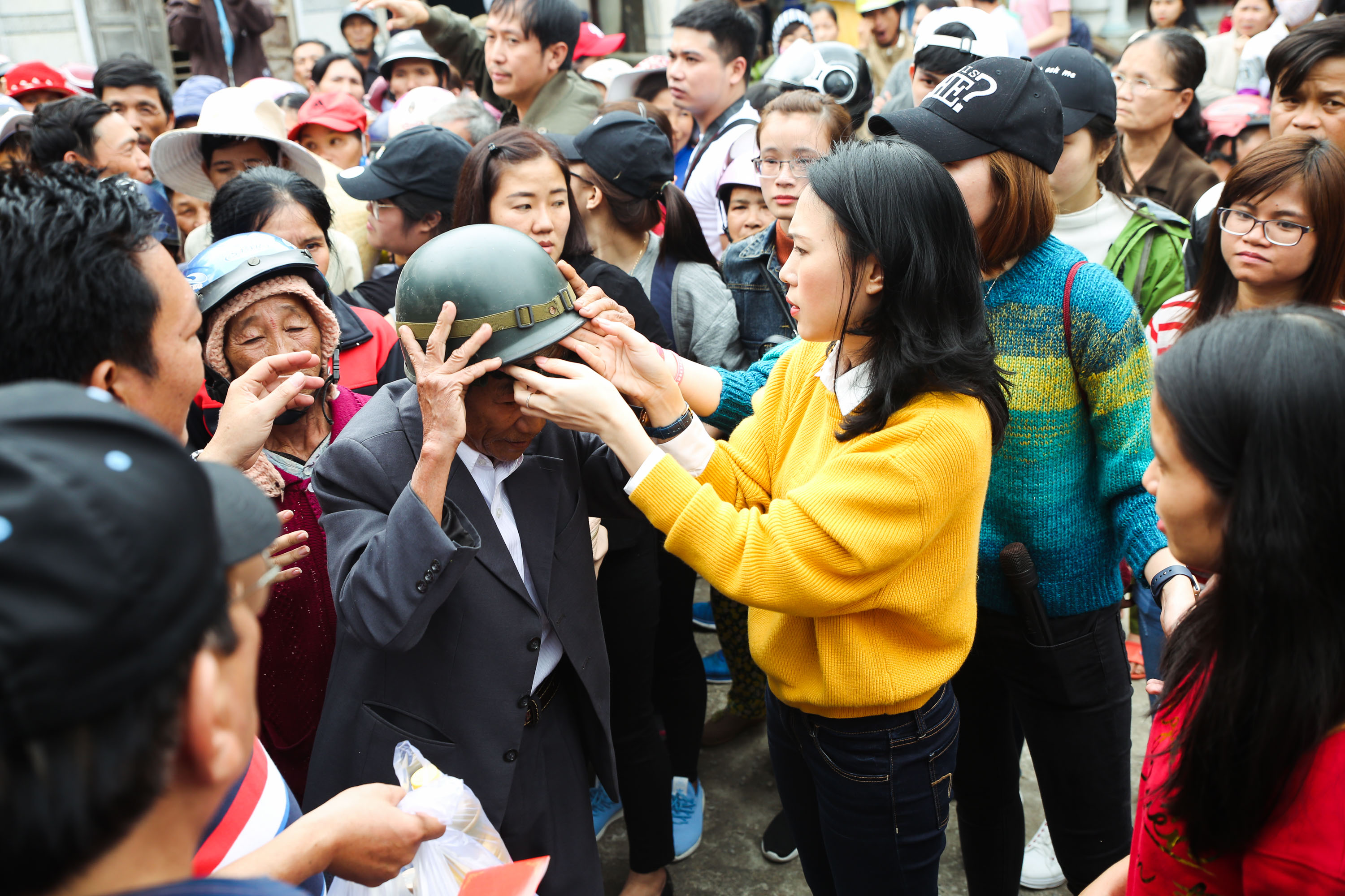 Mỹ Tâm ân cần trao quà cho từng bà con.