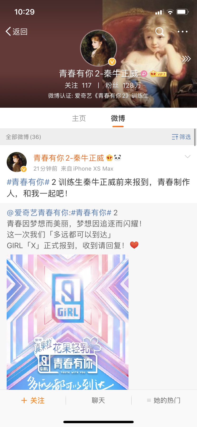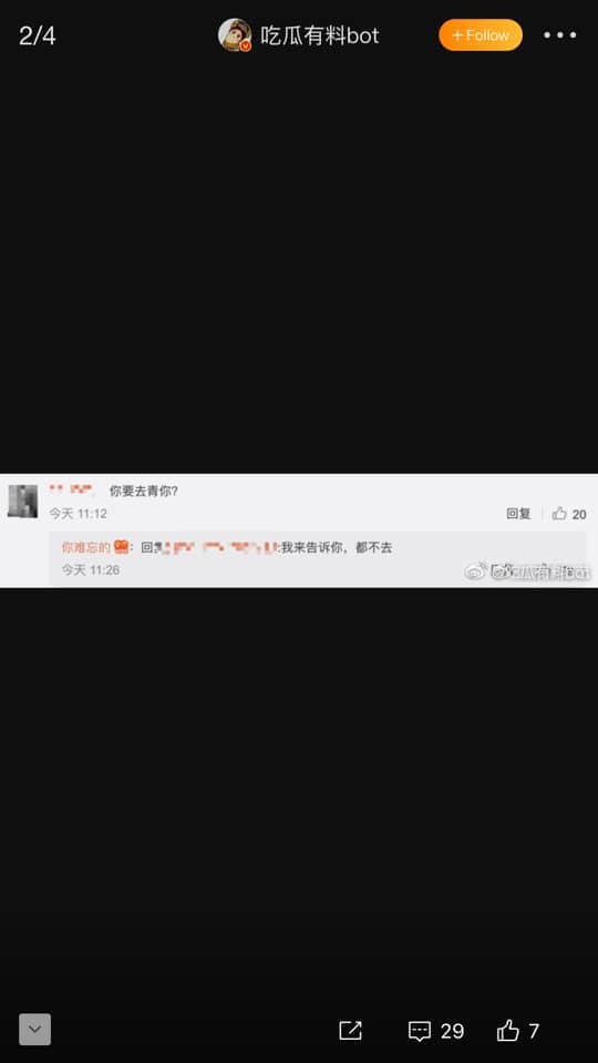 Cư dân mạng sau đó vào Weibo hỏi cô nàng có tham gia show hay không, Tần Ngưu Chính Uy thẳng thắn ghi rằng: “Đều không đi”. (Không đi Sáng Tạo Doanh của Tencent và Thanh Xuân Có Bạn của iQiyi)
