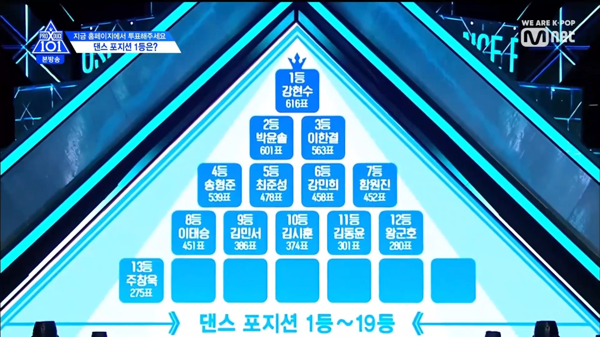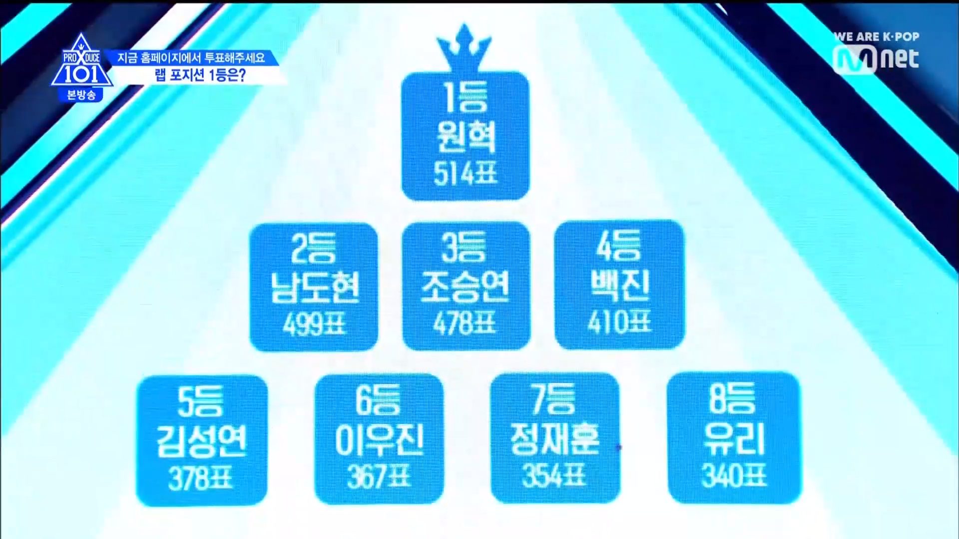 Sunho 6, Dongbin 5, center Kookheon đạt hạng 4. Anh cả Park Sunho xếp cuối bảng. Son Dong Pyo đứng hạng 3, đôi bạn thân Yun Seong và Dong Hyun tranh hạng 1. Cuối cùng, Yun Seong xuất sắc dẫn đầu, xứng đáng với công sức mà anh chàng đã bỏ ra.