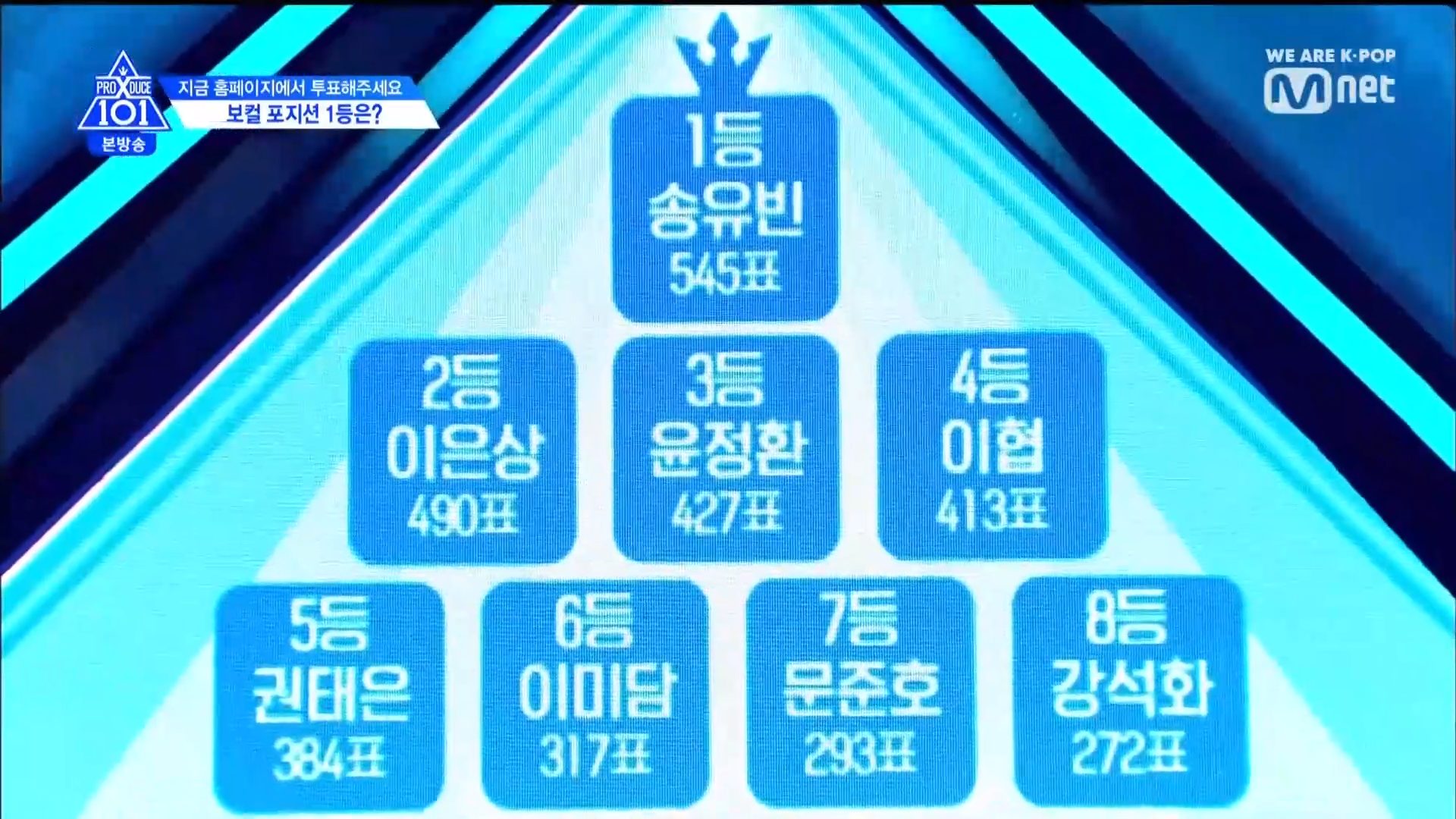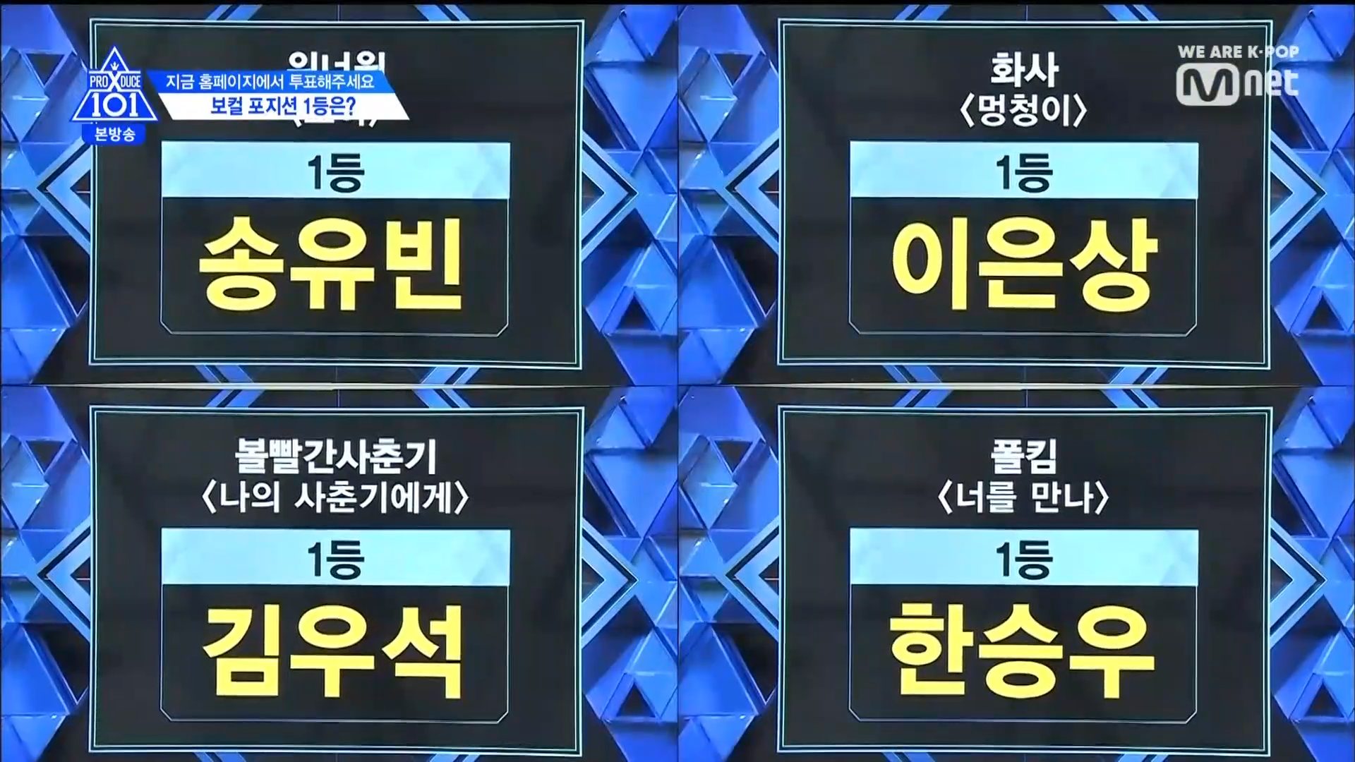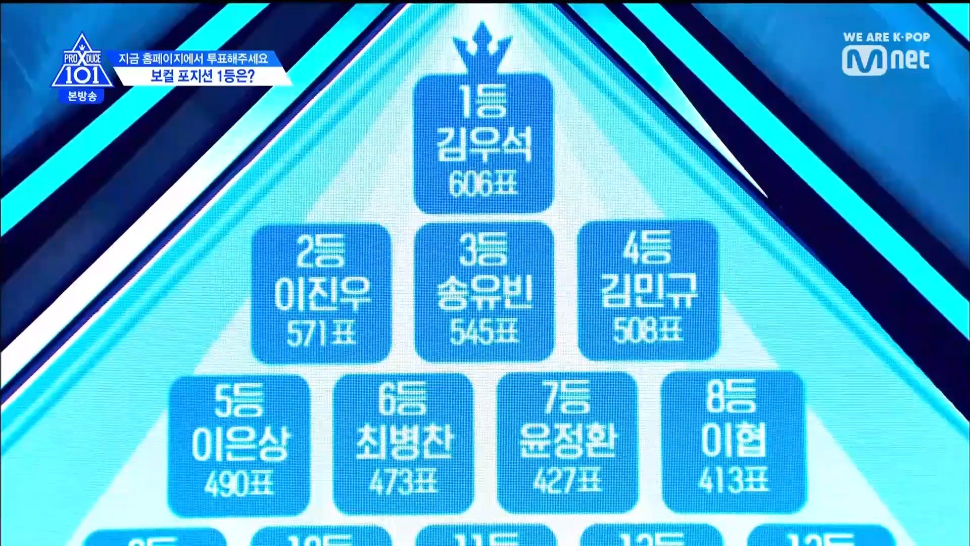 Kim Mingyu bất ngờ xếp hạng 3, đồng nghĩa Jinwoo và Wooseok sẽ tranh nhau hạng 1. Wooseok xuất sắc giành hạng 1.