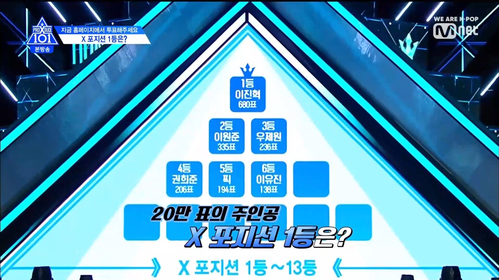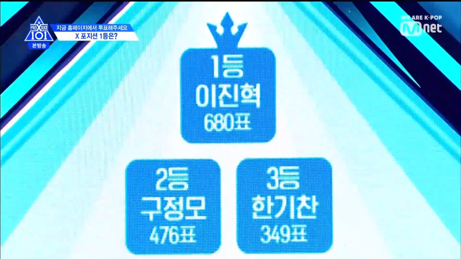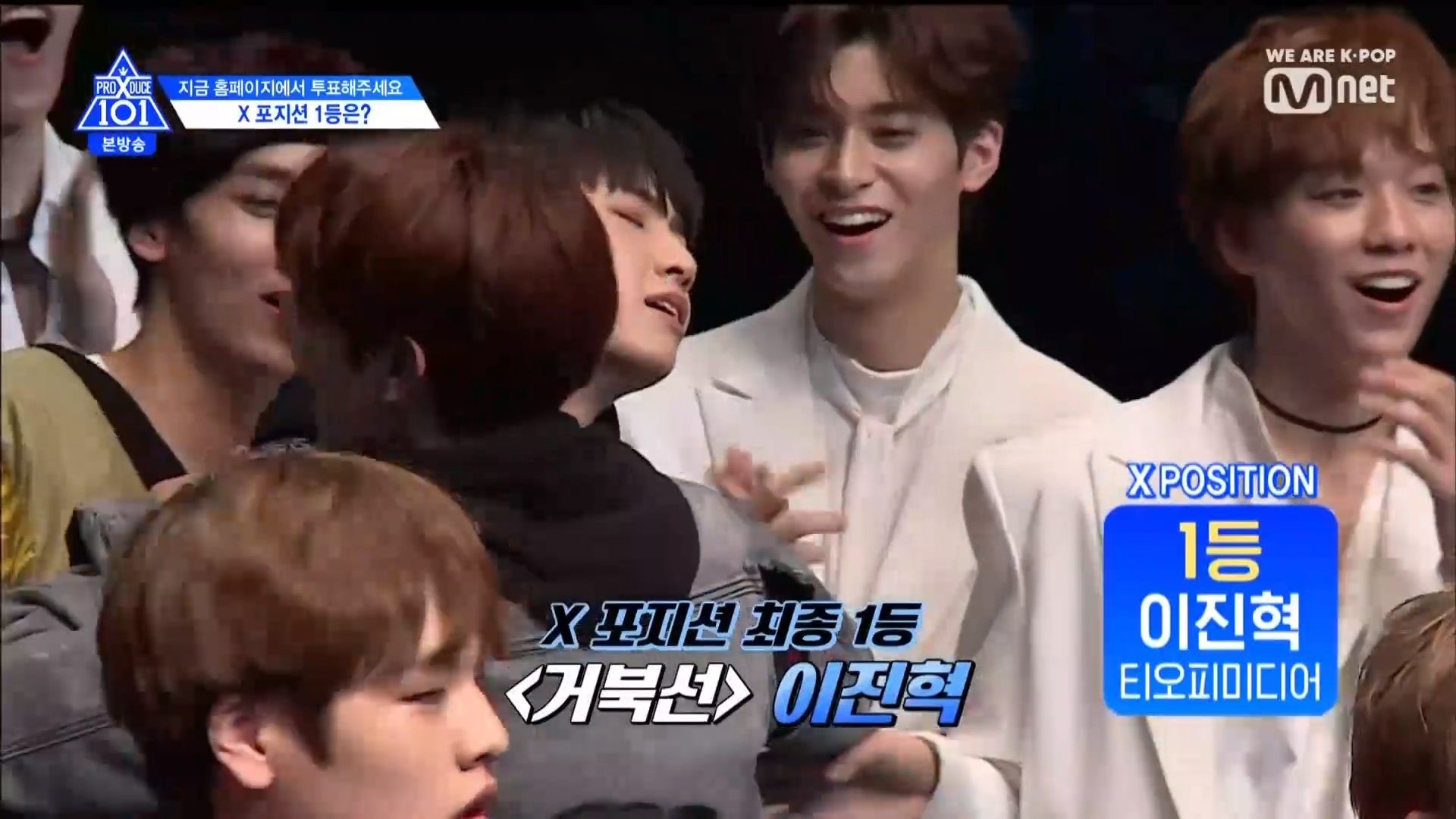 Tiếp theo sẽ là 2 team của mảng X. Đây sẽ là cuộc chiến tranh No.1 giữa Jinhyuk và Jungmo. Lee Jin Hyuk sở hữu 680 vote cao hơn cả Kim Woo Seok trước đó. Số phiếu Jin Hyuk hiện đang cao ngất ngưởng, hơn cả Wooseok của mảng vocal. TTS Lee Jin Hyuk xuất sắc giành hạng 1 vị trí X.