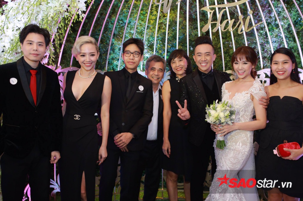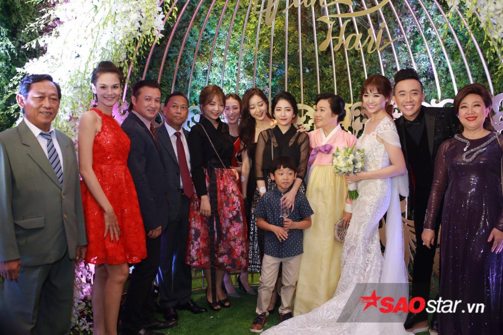 Trong 300 khách mời đến tham dự tiệc cưới, ngoài gia đình và bạn bè, những tên tuổi quen thuộc của làng giải trí đều có mặt trong đám cưới của Trấn Thành - Hari Won.