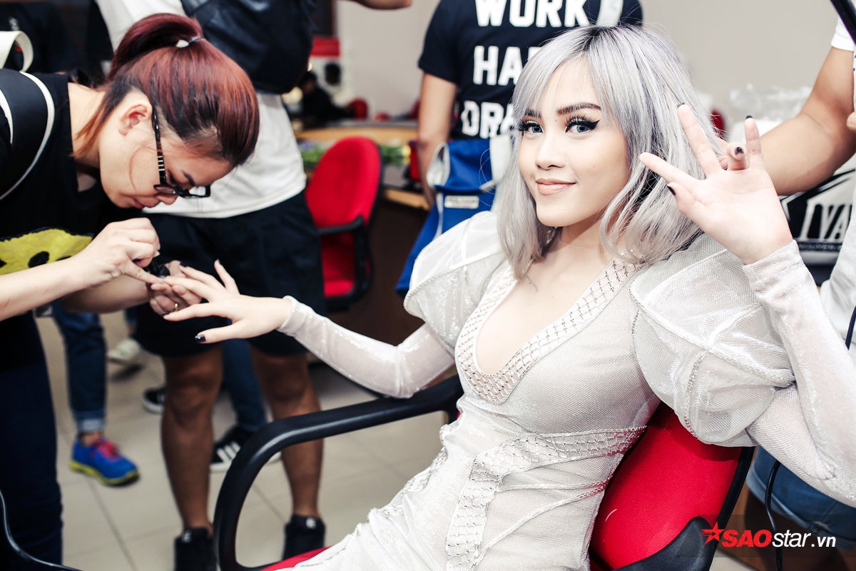 Thiều Bảo Trâm có mặt tại sân khấu từ khá sớm, cô nàng tranh thủ trang điểm để dành thời gian chỉn chu hơn phần biểu diễn của mình.