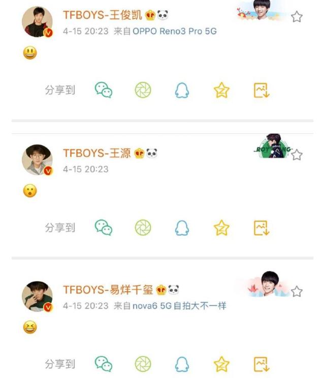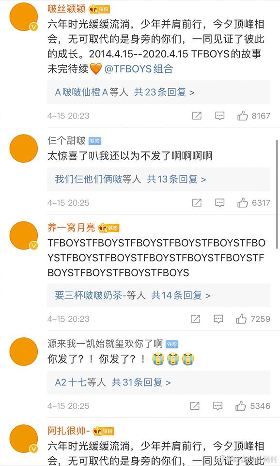 Biểu cảm của mỗi thành viên được đăng tải trên Weibo chính là tâm trạng của chính họ khi được xướng tên đoạt được giải vào sáu năm trước. Không chỉ có TFBOYS mà cả các fan hâm mộ của TFBOYS cũng chuyển sang avatar màu cam (màu đại diện của nhóm) để chúc mừng thần tượng.