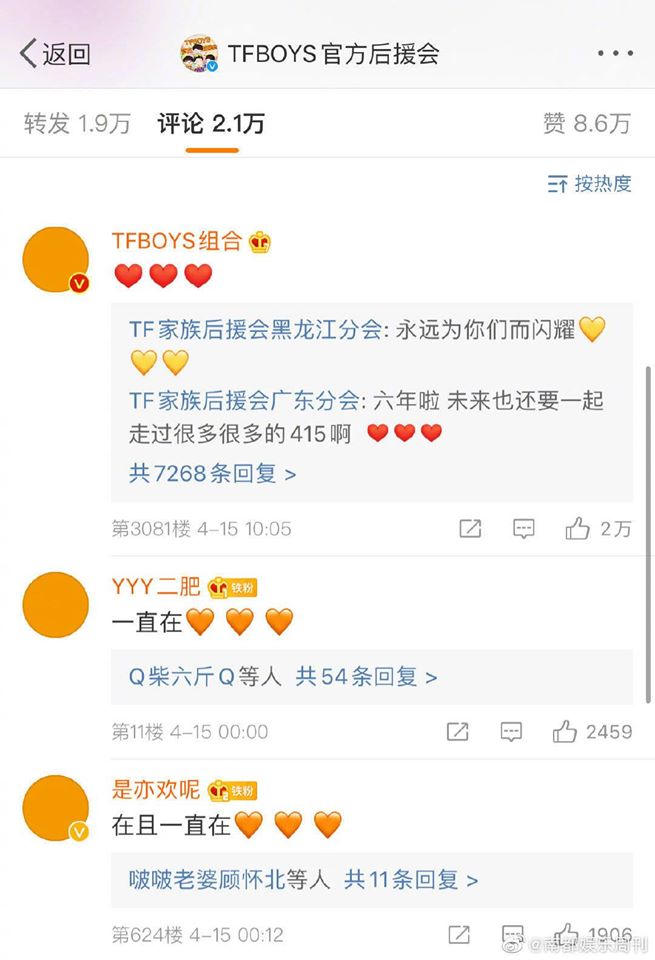 Ngày 15/04 cả ba thành viên TFBOYS đồng loạt cùng đăng bài Weibo với nội dung là những biểu tượng cảm xúc khác nhau. Nguyên nhân của động thái này chính là để kỉ niệm sáu năm nhóm nhận giải thưởng tại YinYueTai VChart Awards 2014. Cột mốc này có ý nghĩa rất lớn với nhóm, nhờ nó, cả ba thành viên đã chứng minh được năng lực, phản bác lại sự phê phán từ cư dân mạng. Vì vậy, ngày đó là một ngày đáng nhớ của cả ba.