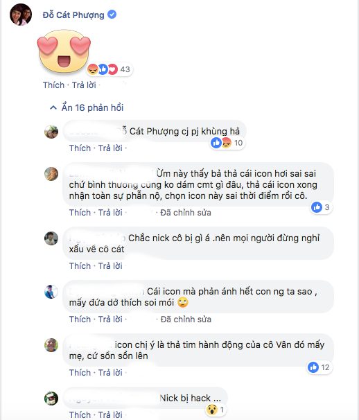 Thế nhưng một bình luận hết sức “khó đỡ” của Cát Phượng đang nhận được sự chú ý từ phía người hâm mộ. Theo đó, nữ diễn viên đã thả icon hình mặt cười trái tim. Và rất đông khán giả đã vào “ném đá” chỉ trích nữ diễn viên. Tuy nhiên một số ý kiến cho rằng, Cát Phượng đang thả tim cho hành động của Hồng Vân chứ không hề có ác ý gì khác.