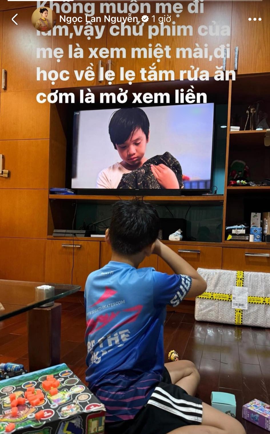 Tối ngày 28/8, diễn viên Ngọc Lan đăng tải khoảnh khắc bên cạnh con trai. Nữ diễn viên cho hay: "Không muốn mẹ đi làm. Vậy chứ phim của mẹ là xem miệt mài, đi học về lẹ lẹ tắm rửa ăn cơm là mở xem liền". Dù không muốn mẹ đi làm, thế nhưng con trai Ngọc Lan vẫn "mê mệt" các vai diễn của mẹ. Ngay sau khi chia sẻ, dân tình càng thêm yêu quý, ngưỡng mộ tình cảm của mẹ con Ngọc Lan.