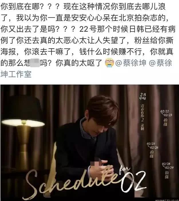 Rạng sáng ngày 27.01, không ít dân mạng cảm thấy fan hâm mộ của Thái Từ Khôn đang hoảng loạn, thậm chí có người muốn rời bỏ fandom. Nguyên nhân là vì khuya ngày 26.02, Thái Từ Khôn xuất hiện tại sân bay Bắc Kinh, căn cứ lịch trình trước đó, nam ca sỹ chính là từ Hàn Quốc trở về. Mà nhiều fan không rõ, cứ tưởng thần tượng từ tỉnh khác của Trung Quốc về Bắc Kinh làm việc, nên cảm thấy mình bị lừa gạt.