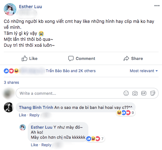 Mới đây, trên trang cá nhân, Hari Won gây chú ý khi chia sẻ dòng trạng thái than thở về việc bị những người dùng trong danh sách bạn bè nói xấu. Cô viết: “Có những người kết bạn xong viết comment hay like những hình hay clip mà không hay về mình. Tâm lý gì kỳ vậy. Một lần thì thôi bỏ qua. Duy trì thì thôi xoá luôn”.