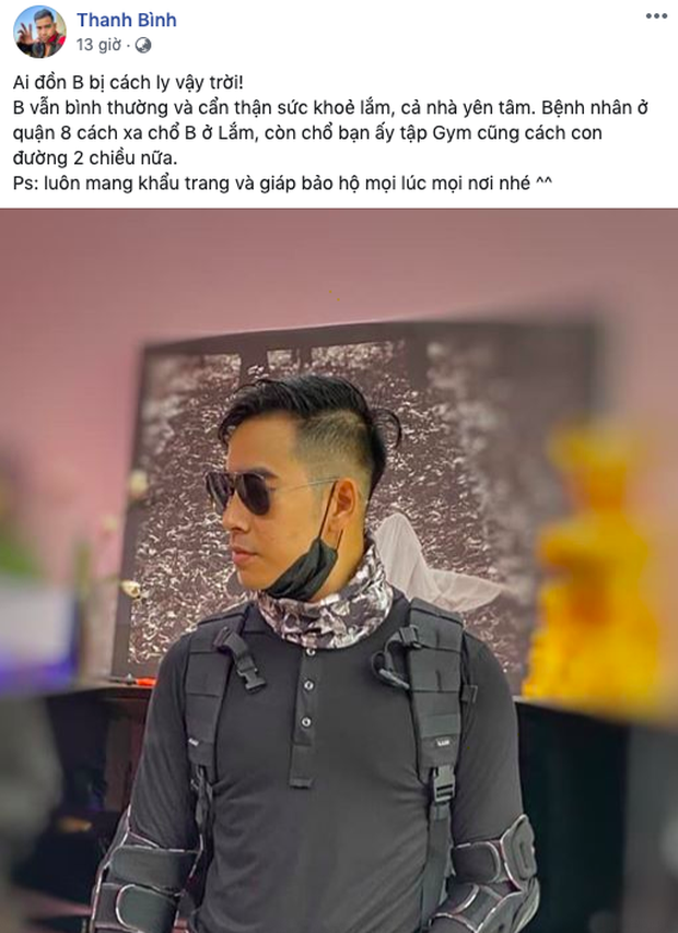 “Bệnh nhân ở quận 8 cách xa chỗ Bình ở lắm, còn chỗ bạn ấy tập Gym cũng cách con đường 2 chiều nữa”, Thanh Bình chia sẻ. Đồng thời, trước diễn biến phức tạp của dịch bệnh anh cũng khuyên mọi người hãy đeo khẩu trang và giáp bảo hộ để đảm bảo an toàn cho bản thân, gia đình và cộng đồng.