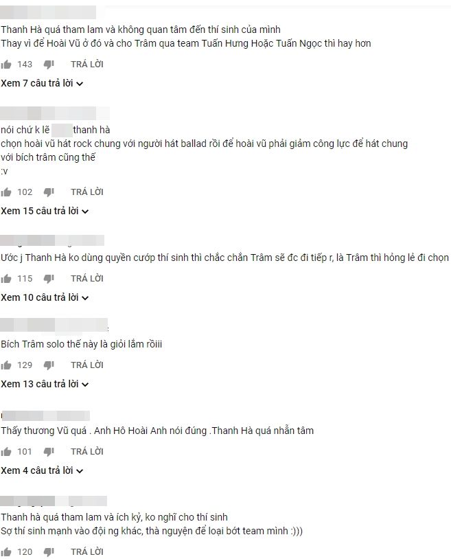 Nhiều khán giả đồng tình với lời khuyên muộn màng của huấn luyện viên Hồ Hoài Anh rằng Thanh Hà nên nhường Bích Trâm cho 1 trong 2 đồng nghiệp đã ấn nút cứu thí sinh để Hoài Vũ không mất đi cơ hội tiếp tục chờ đợi. Có không ít bình luận còn bày tỏ ý trách móc Thanh Hà bằng những từ ngữ khá nặng nề như “tham lam”, “nhẫn tâm”, “ích kỷ”…