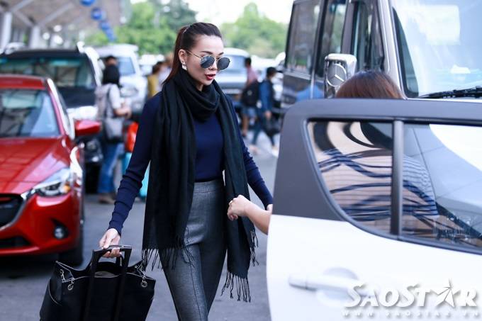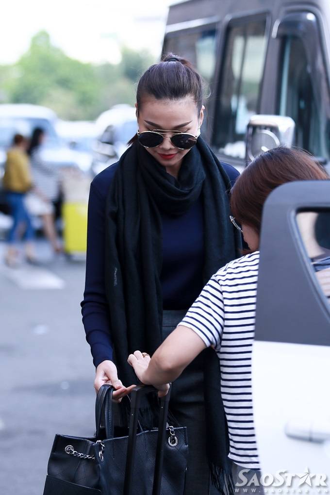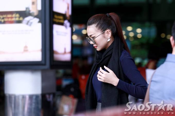 Xuất hiện ở sân bay Tân Sơn Nhất, Thanh Hằng cá biệt nhất khi diện trang phục mùa đông kín mít với quần âu, áo tay dài, khăn choàng cổ…