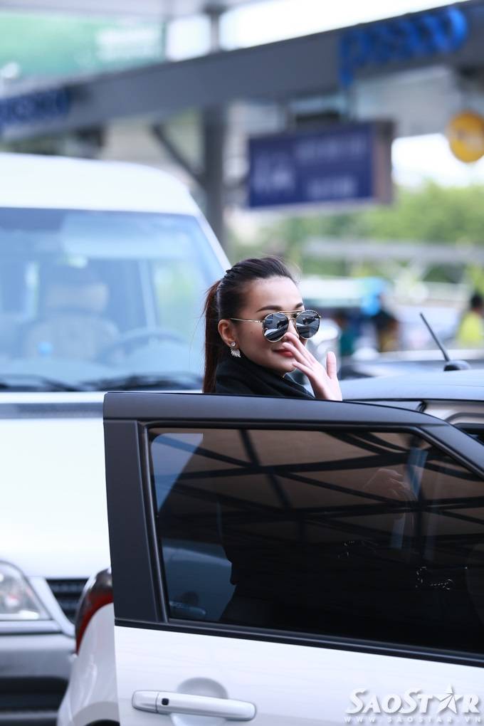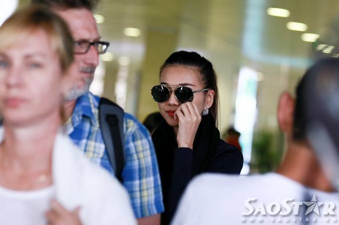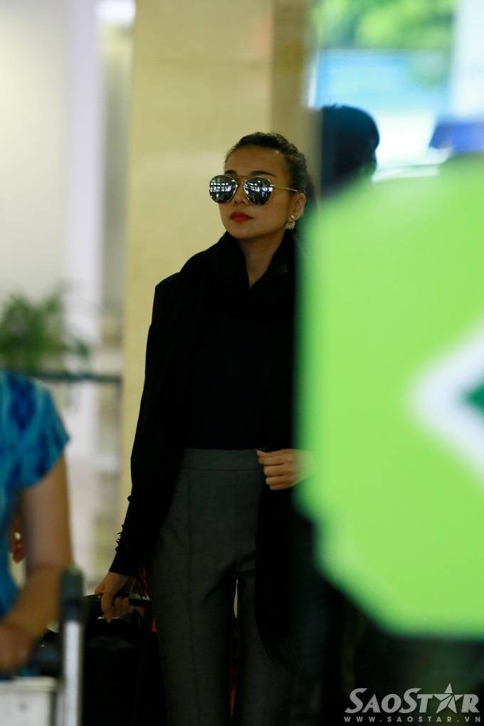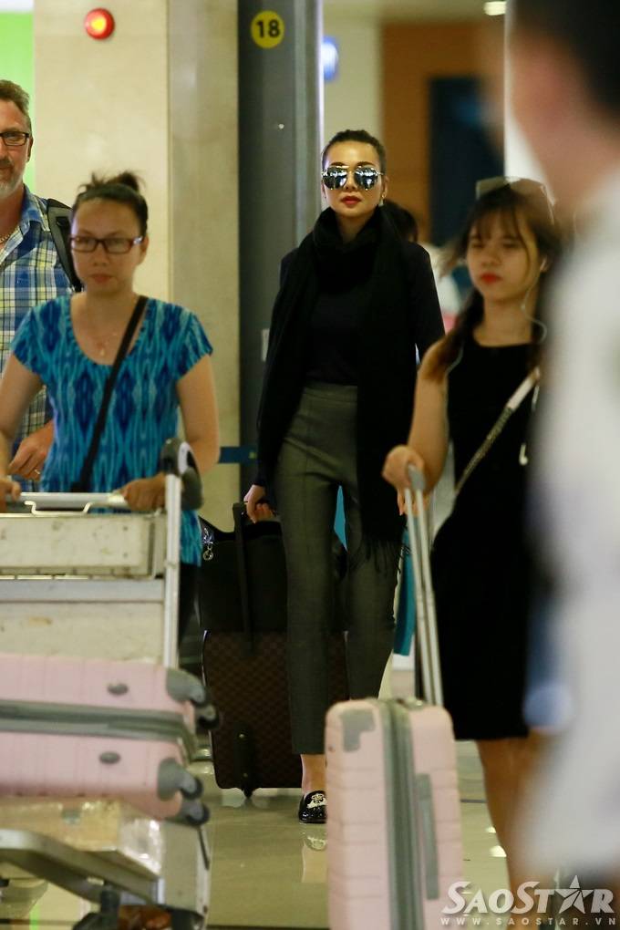 Chân dài làng mẫu diện "cây" đen kết hợp với khăn choàng cổ. Trông cô khác biệt khi xuất hiện tại sân bay vì Sài Gòn nóng như đổ lửa.