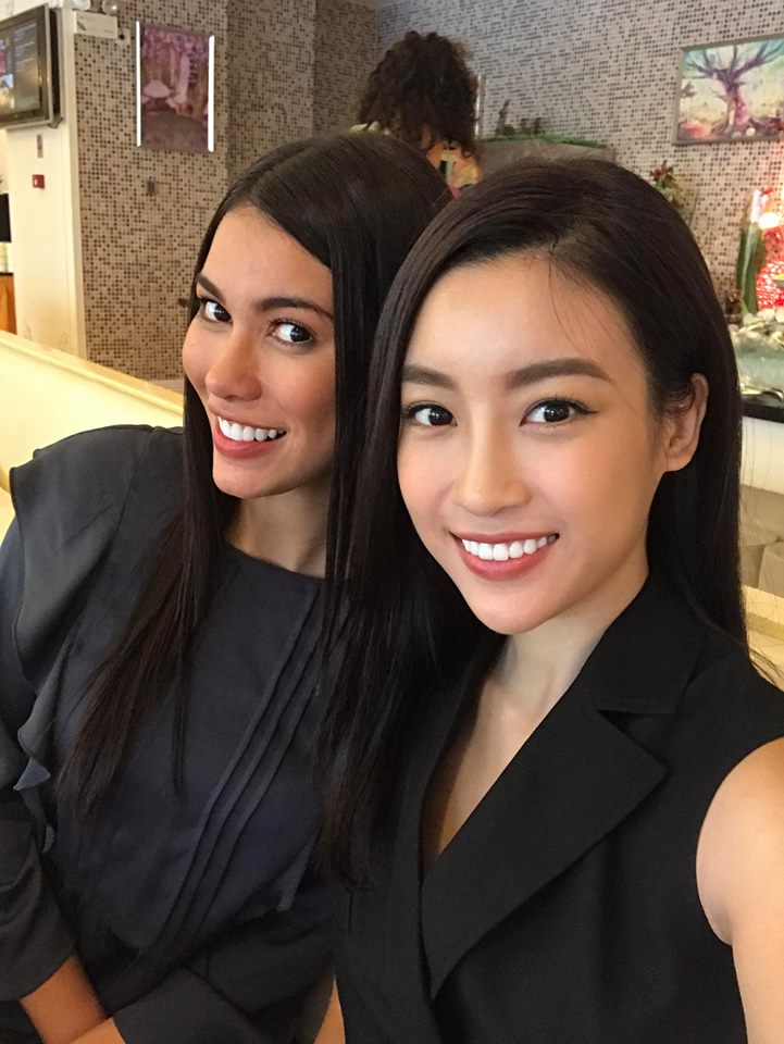 Hoa hậu Việt Nam Đỗ Mỹ Linh đang có mặt tại Trung Quốc tham dự “đấu trường” sắc đẹp Miss World 2017. Trong ảnh, cô chụp cùng đại diện đến từ Colombia.