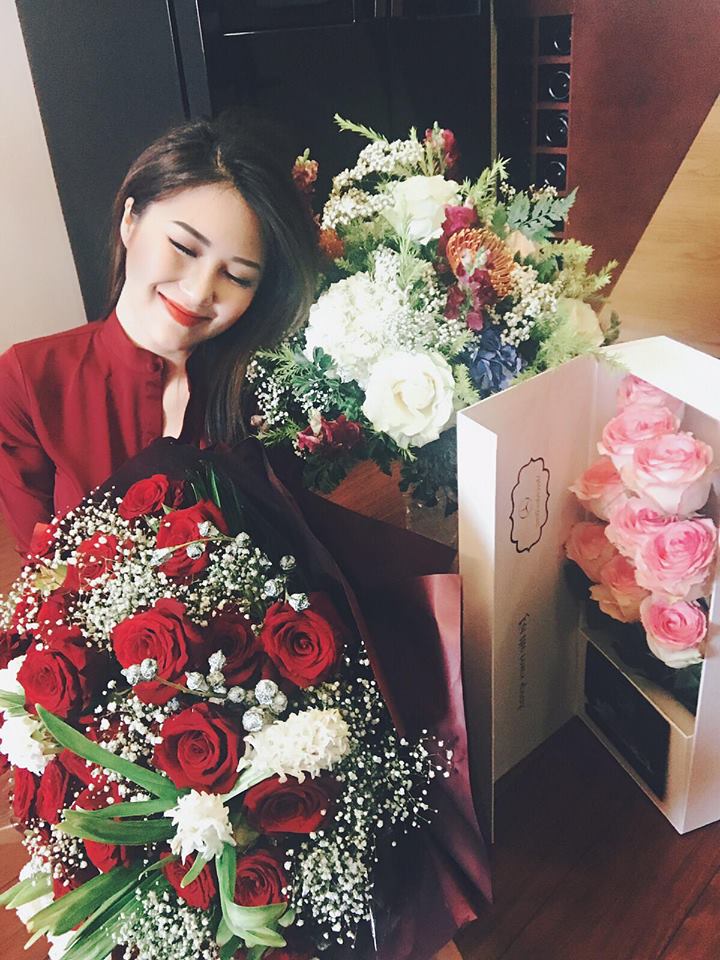 Hương Tràm đăng ảnh ôm hoa cười hạnh phúc trên trang cá nhân cùng dòng chia sẻ : “Cảm ơn những người thương thấu hiểu và tinh tế của tôi. Tại sao không nói mà lại biết là em thích nhất là hoa hồng vậy! Xuống Cần Thơ tối nay có được tặng bông nữa ko ta ? 20/10 vui nhé các chị em phụ nữ ơi…”.