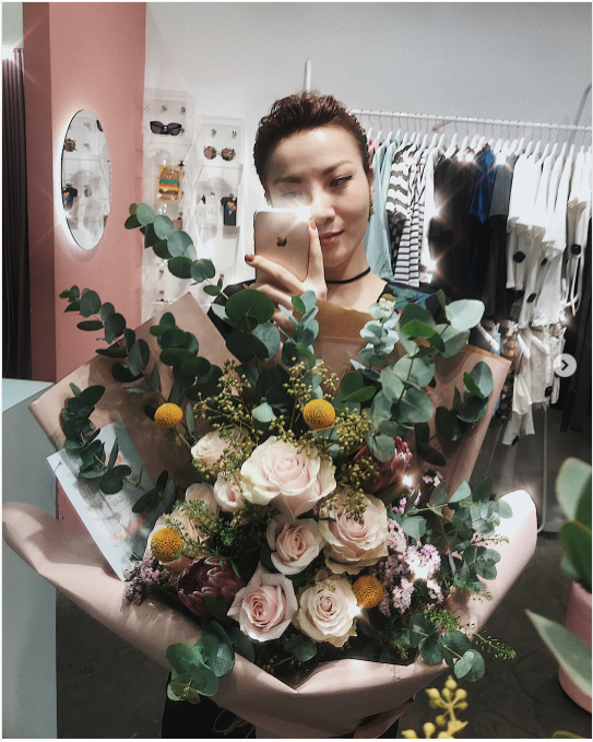 Puka đáng yêu chụp ảnh bên bó hoa được một người bạn tặng.