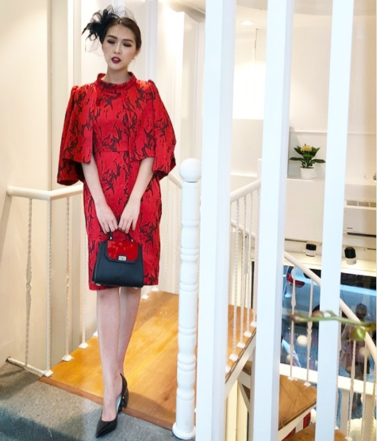 Á quân The Face mùa hai đăng ảnh quyến rũ trong bộ đầm đỏ kèm theo dòng trạng thái: “Nhà nhà đi chơi, người người hò hẹn, em đây cũng xúng xính váy đầm nhưng đi làm”.